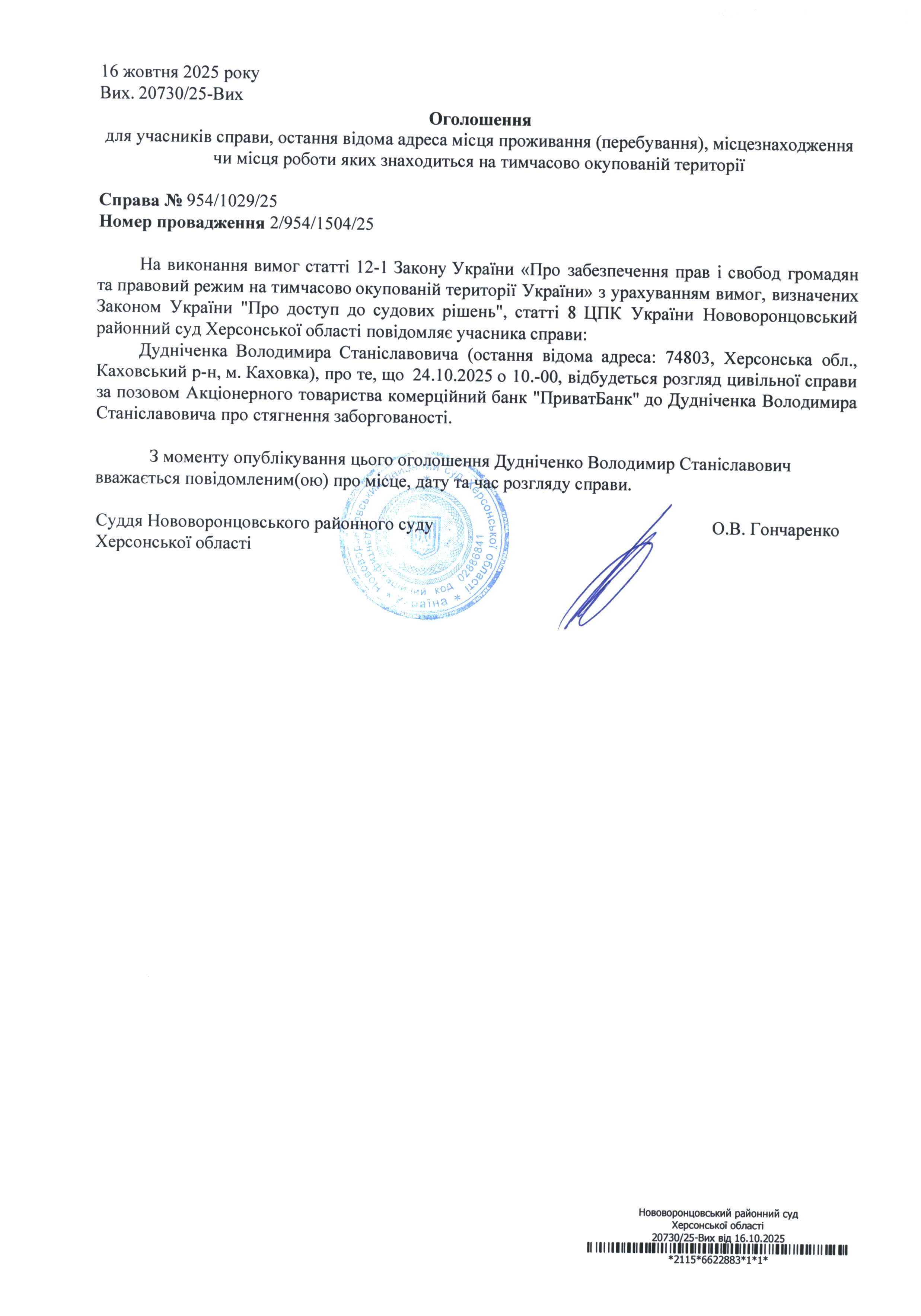 До суду викликається Дудніченко Володимир Станіславович на 10-00 24 жовтня 2025 року