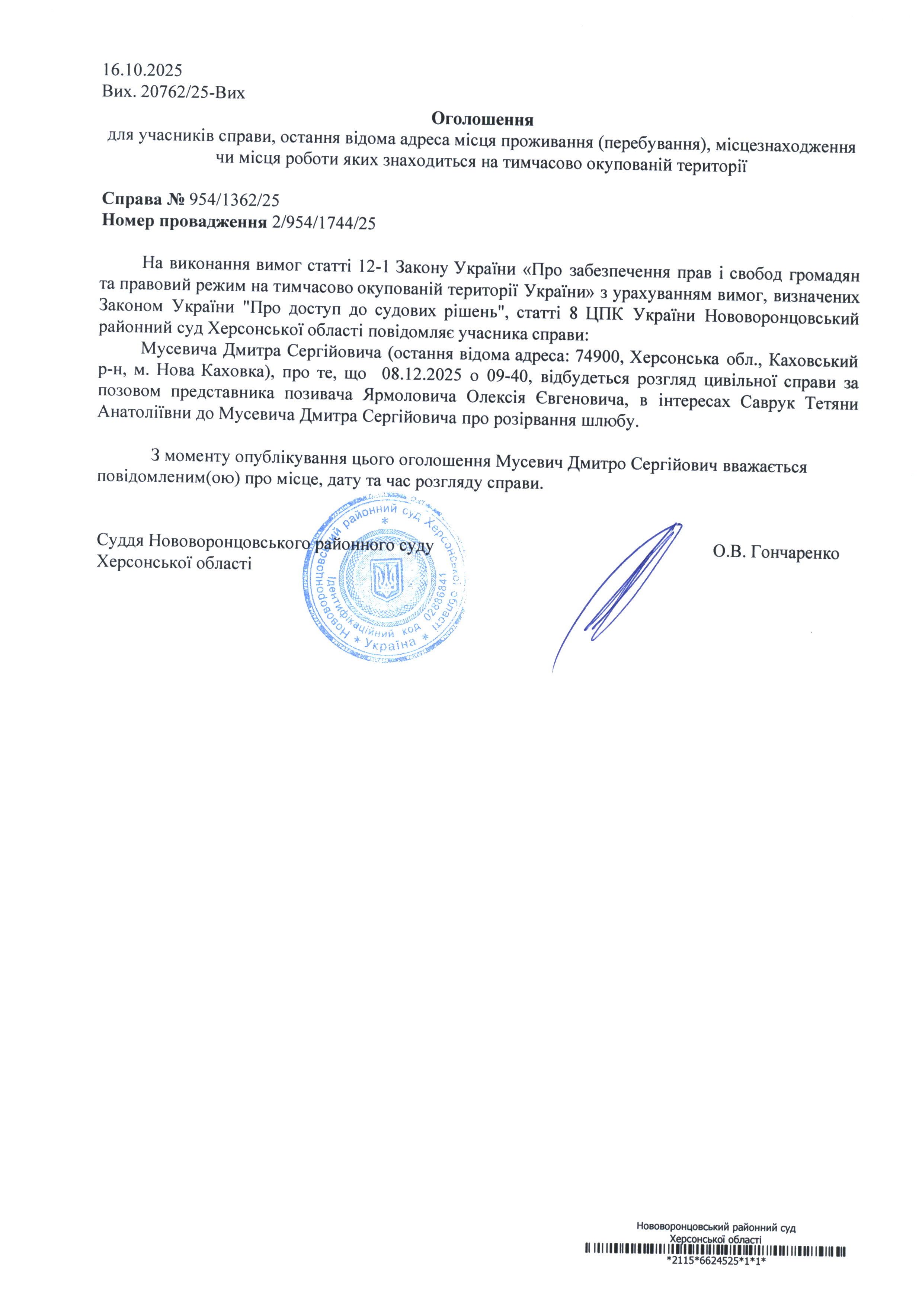 До суду викликається Мусевич Дмитро Сергійович на 09-40 08 грудня 2025 року