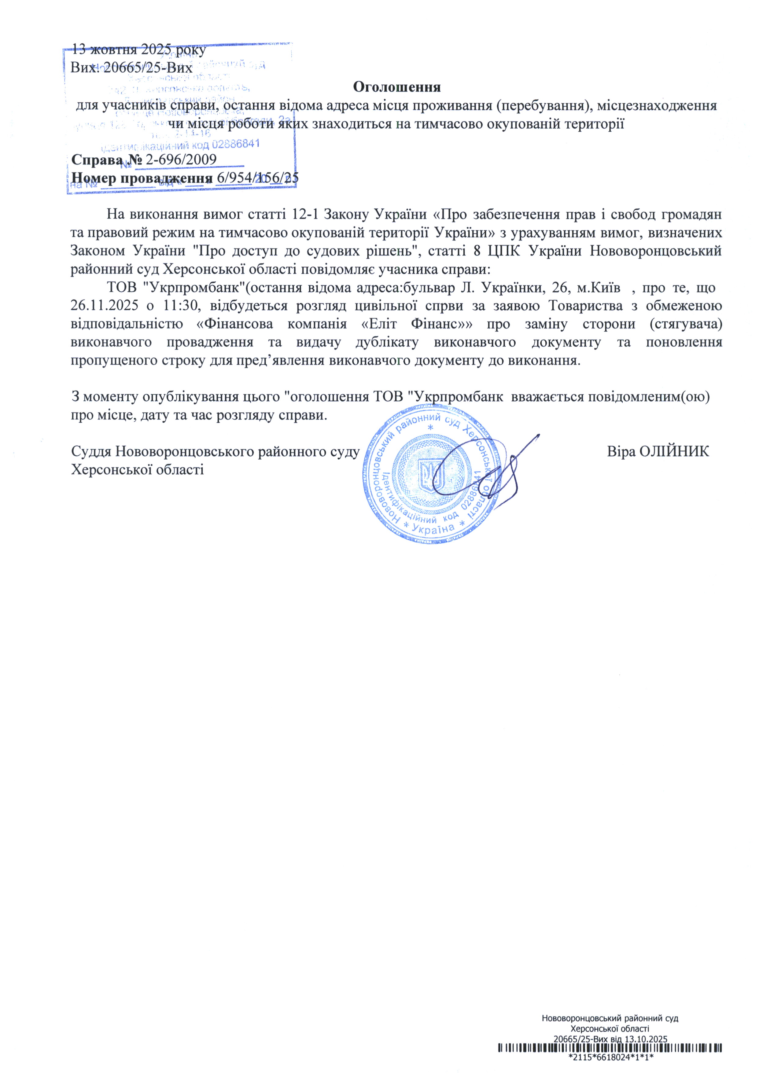 До суду викликається ТОВ "Укрпромбанк" на 11-30 26 листопада 2025 року