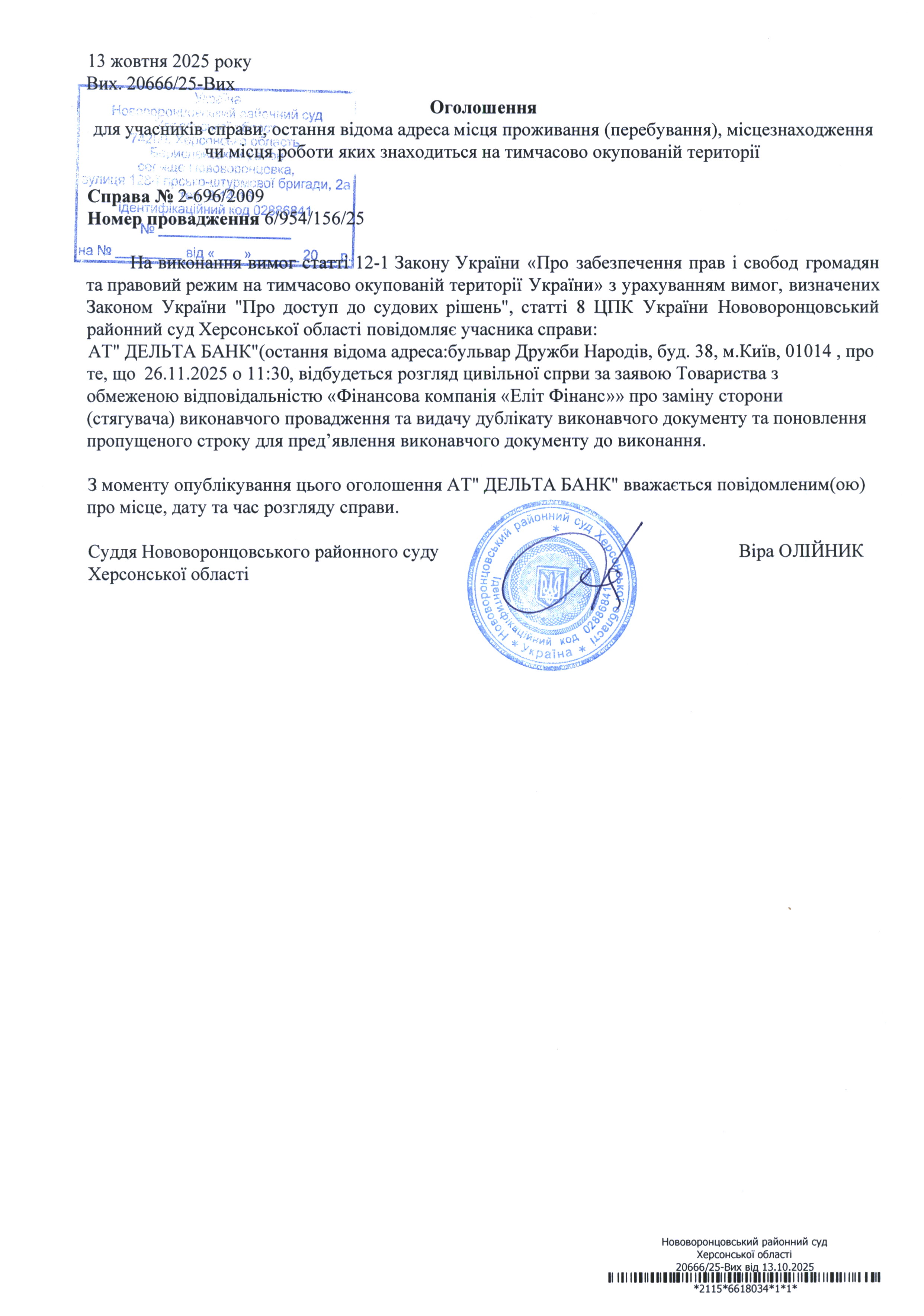 До суду викликається АТ "ДЕЛЬТА БАНК" на 11-30 26 листопада 2025 року