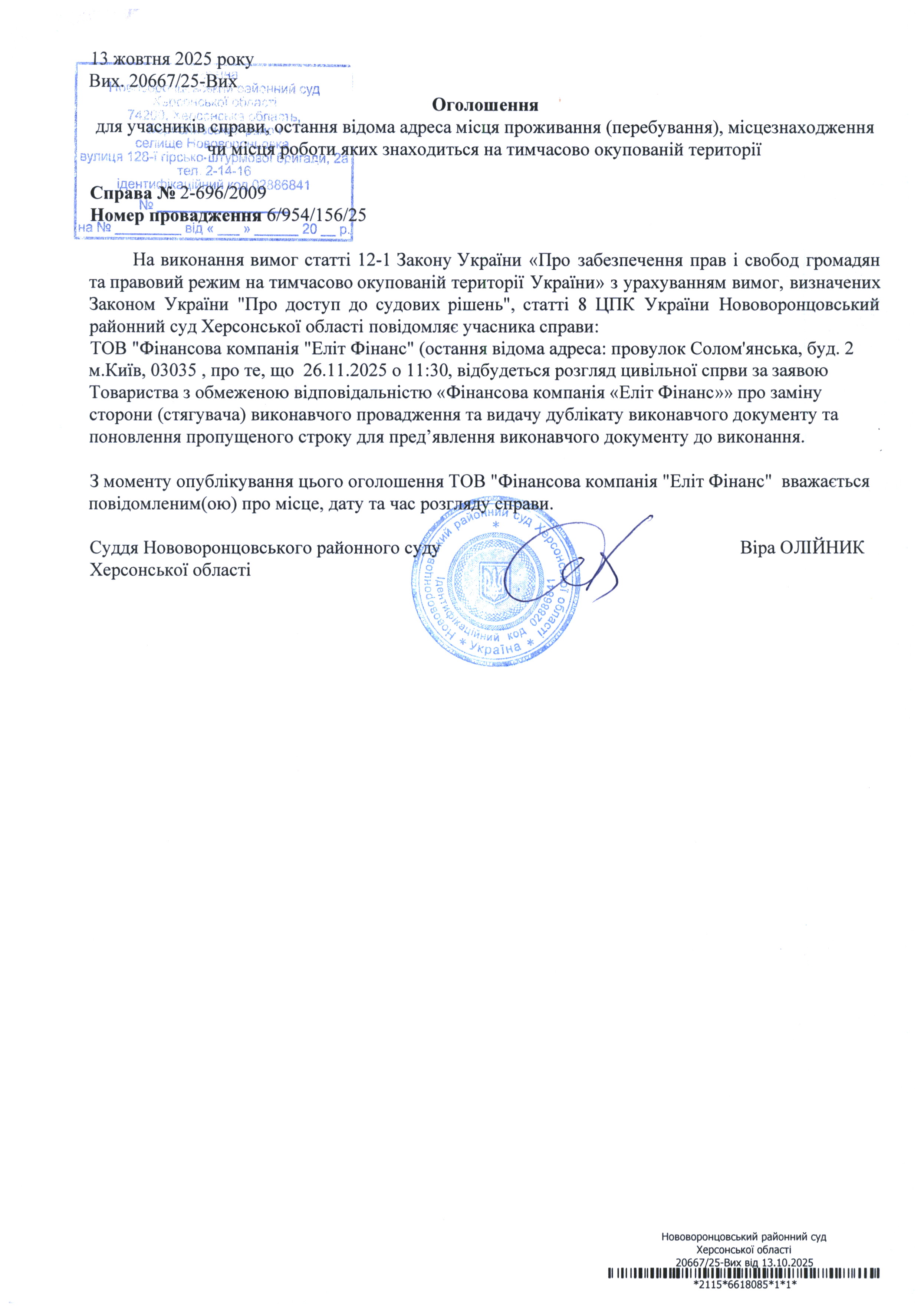 До суду викликається ТОВ "Фінансова компанія "Еліт Фінанс" на 11-30 26 листопада 2025 року