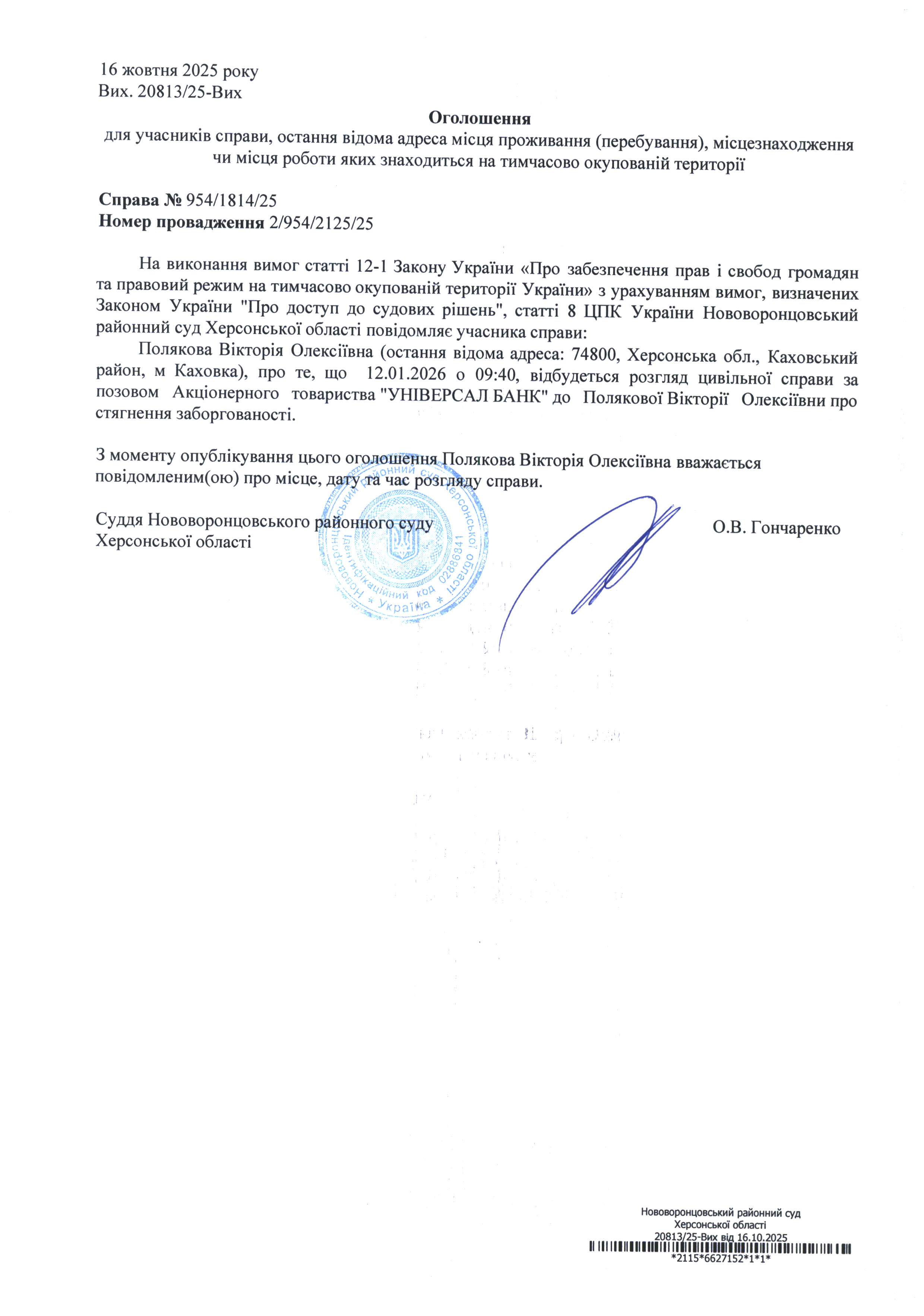 До суду викликається Полякова Вікторія Олексіївна на 09-40 12 січня 2026 року