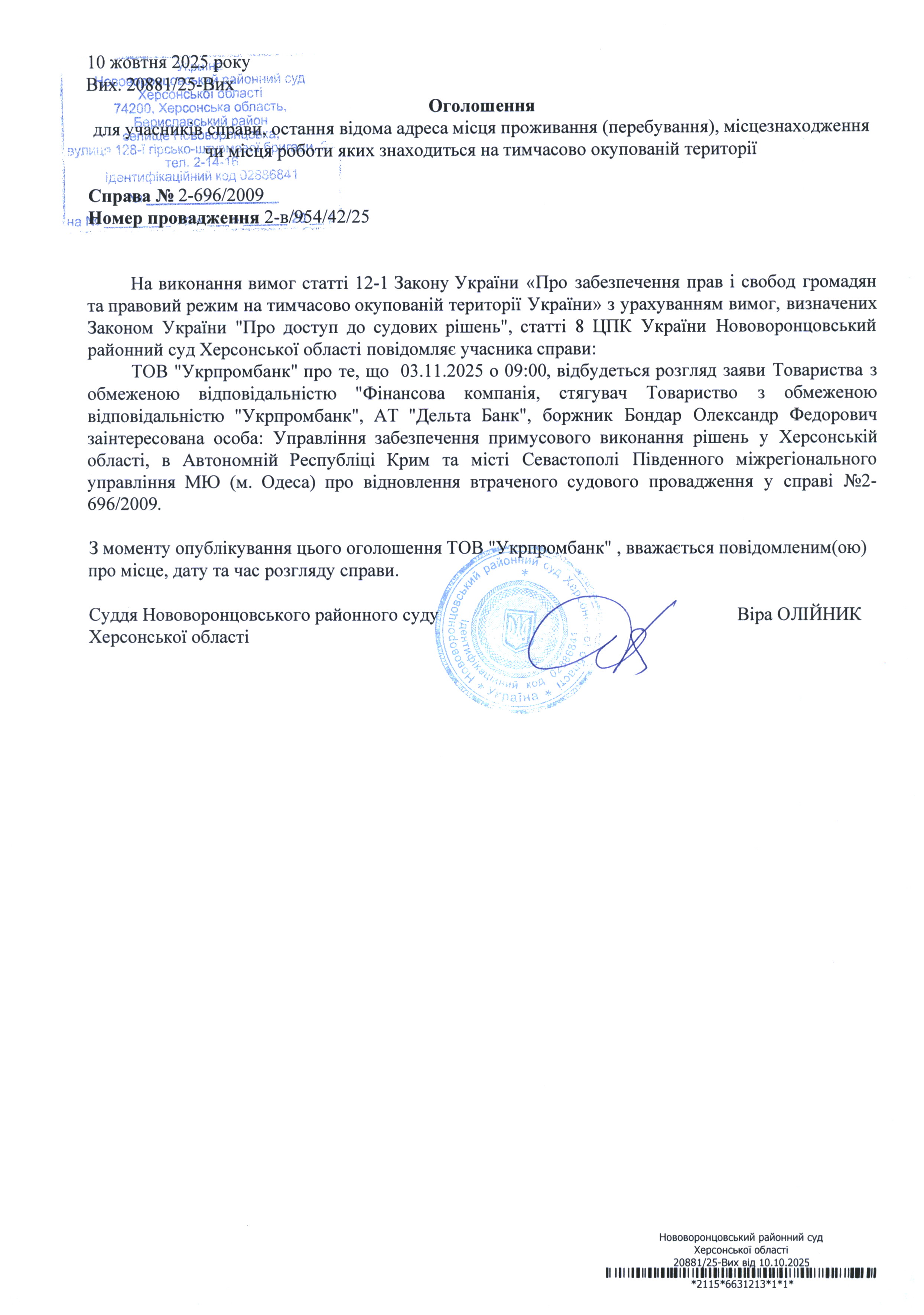 До суду викликається ТОВ "Укрпромбанк" на 09-00 03 листопада 2025 року