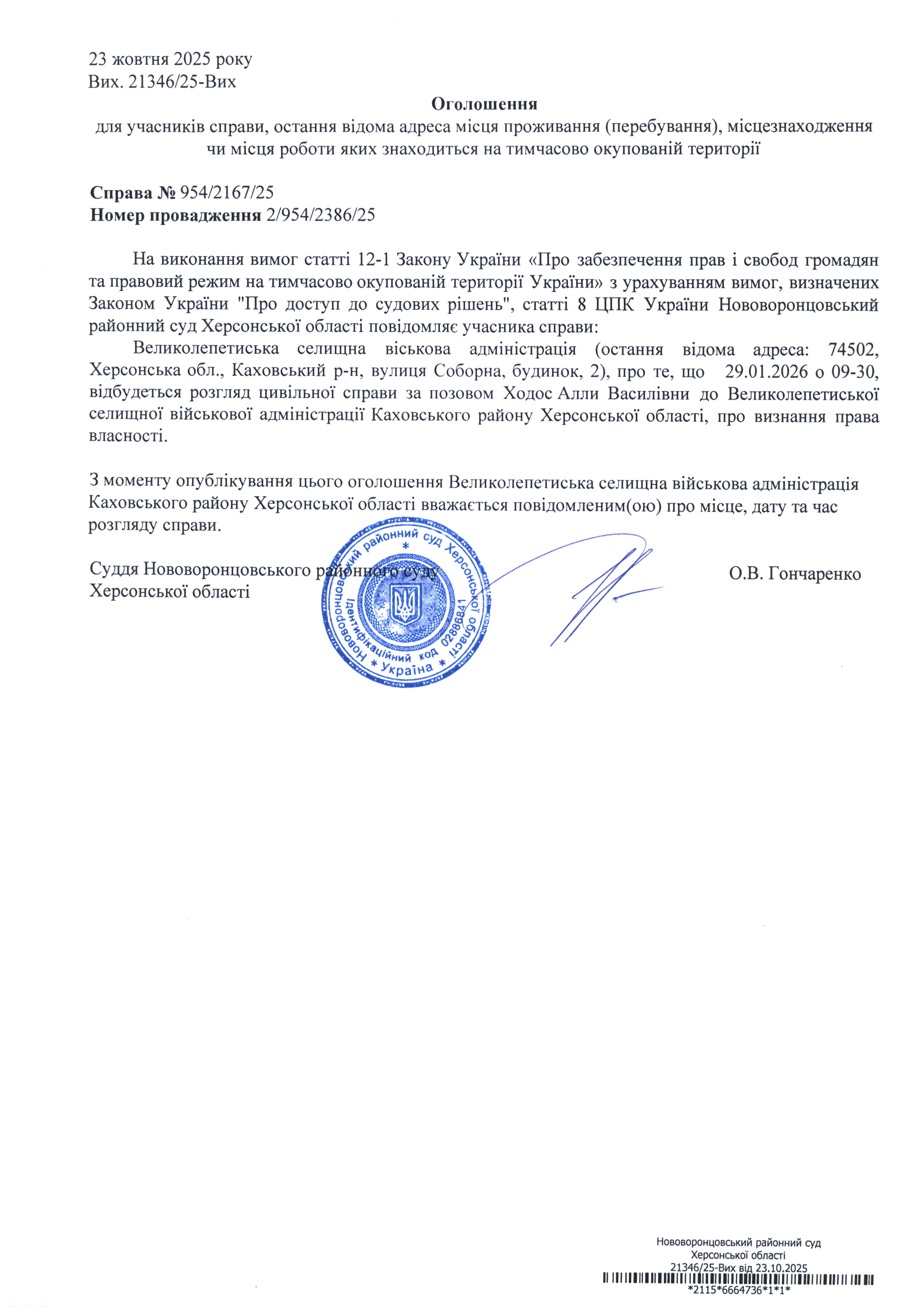 До суду викликається Великолепетиська селищна військова адміністрація на 09-30 29 січня 2026 року