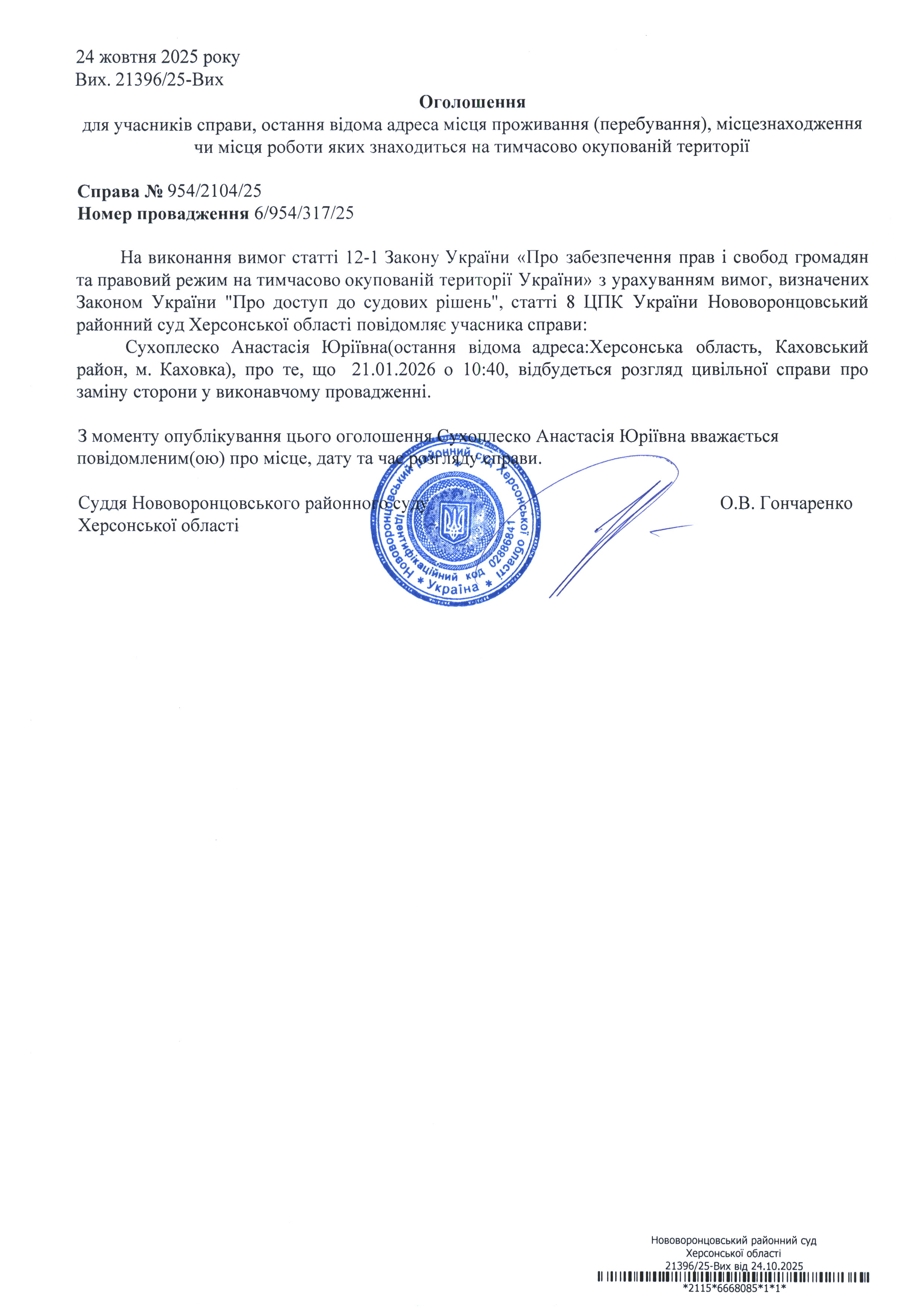 До суду викликається Сухоплеско Анастасія Юріївна на 10 год. 40 хв. 21 січня 2026 року
