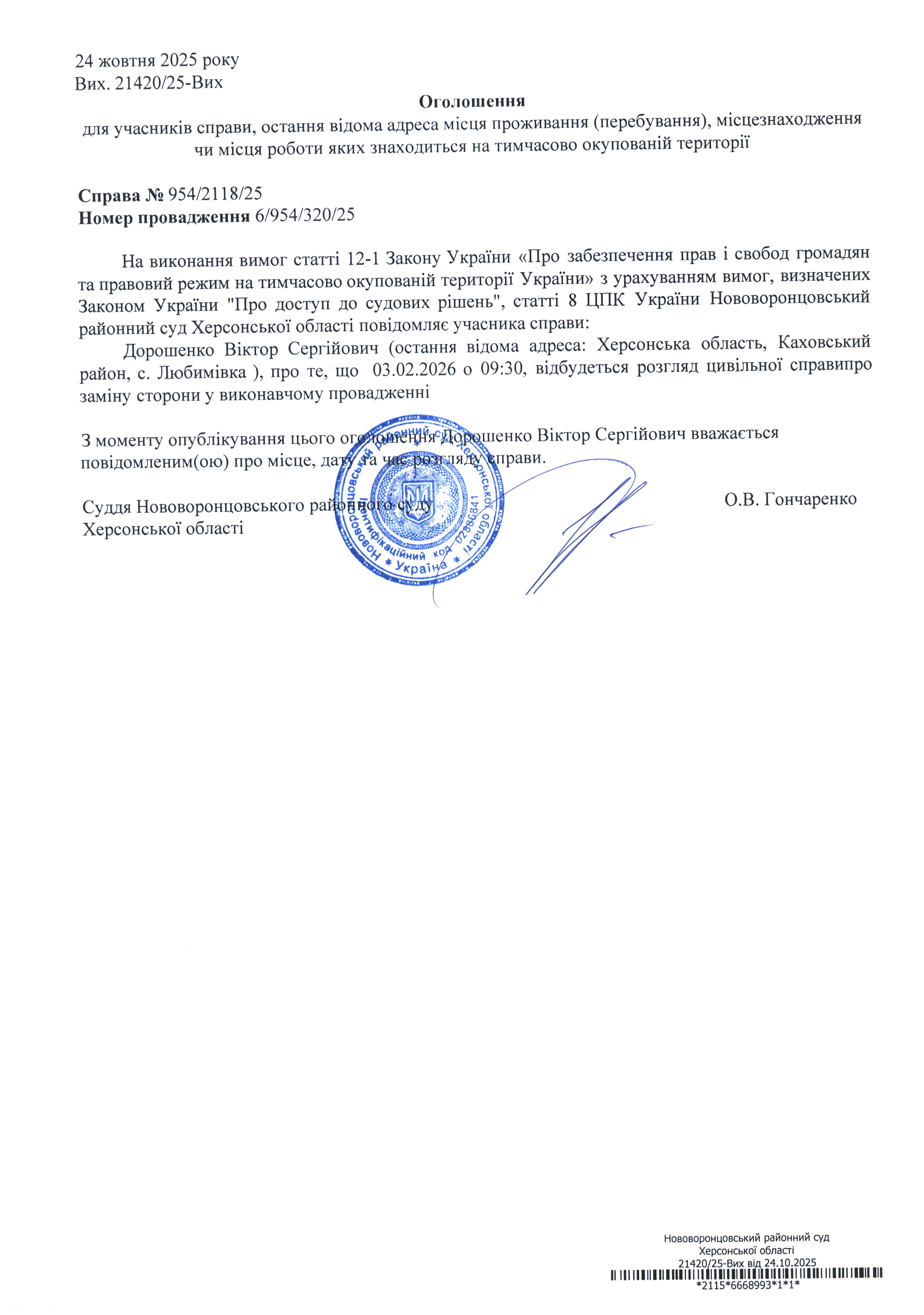 До суду викликається Дорошенко Віктор Сергійович на 9 год. 30 хв. 3 лютого 2026 року