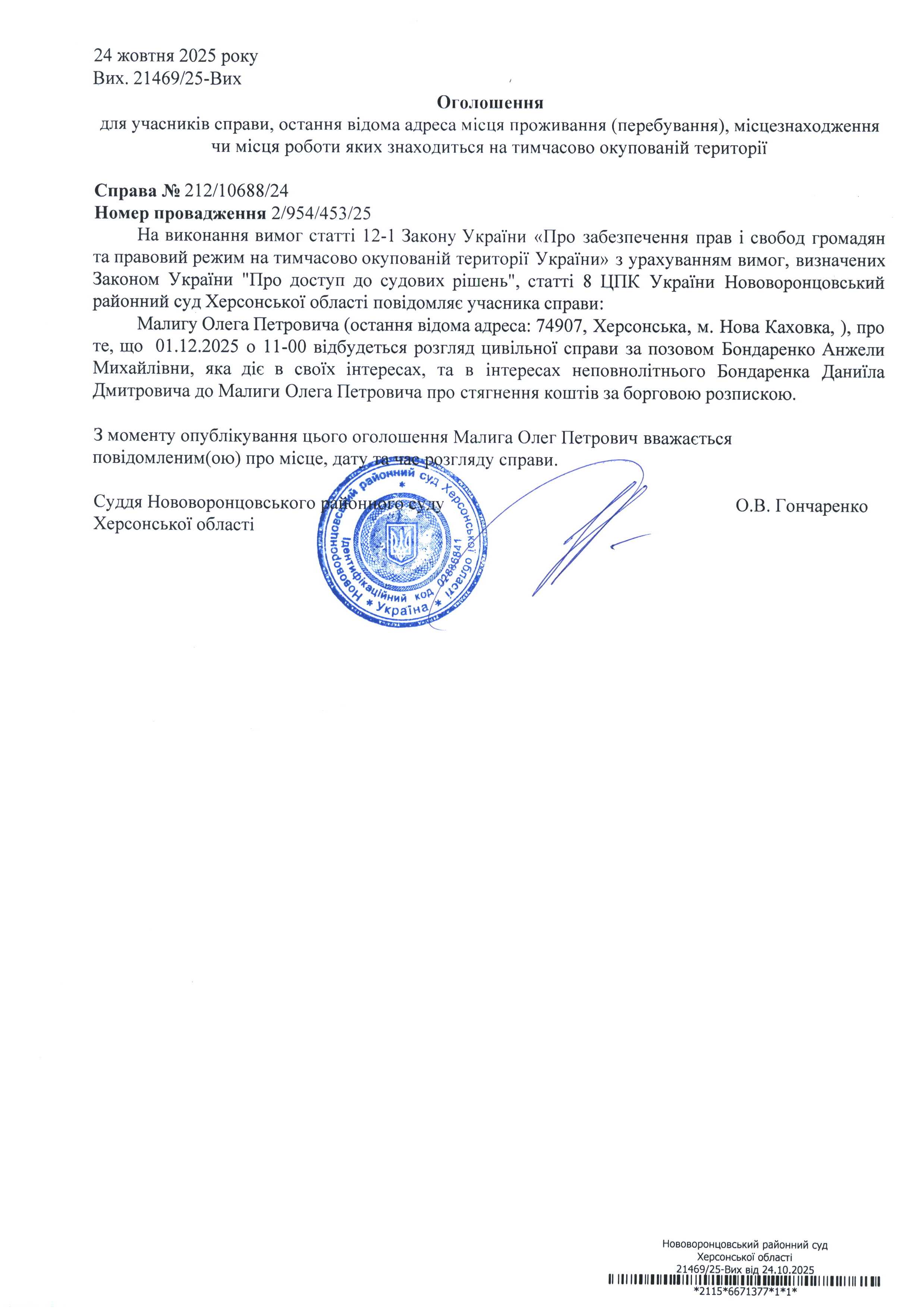 До суду викликається Малига Олег Петрович на 11 год. 00 хв. 1 грудня 2025 року