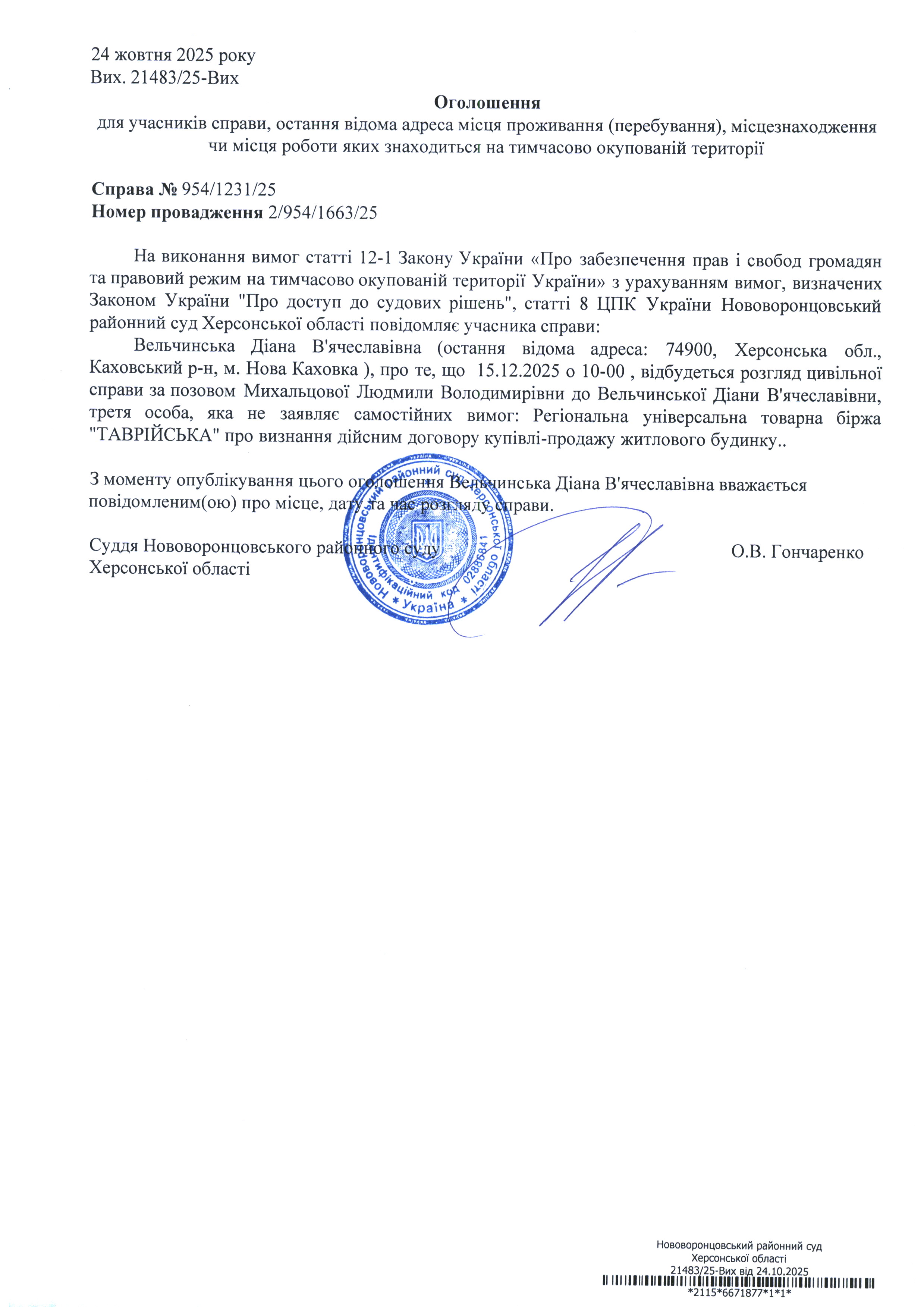 До суду викликається Вельчинська Діана В'ячеславівна на 10 год. 00 хв. 15 грудня 2025 року