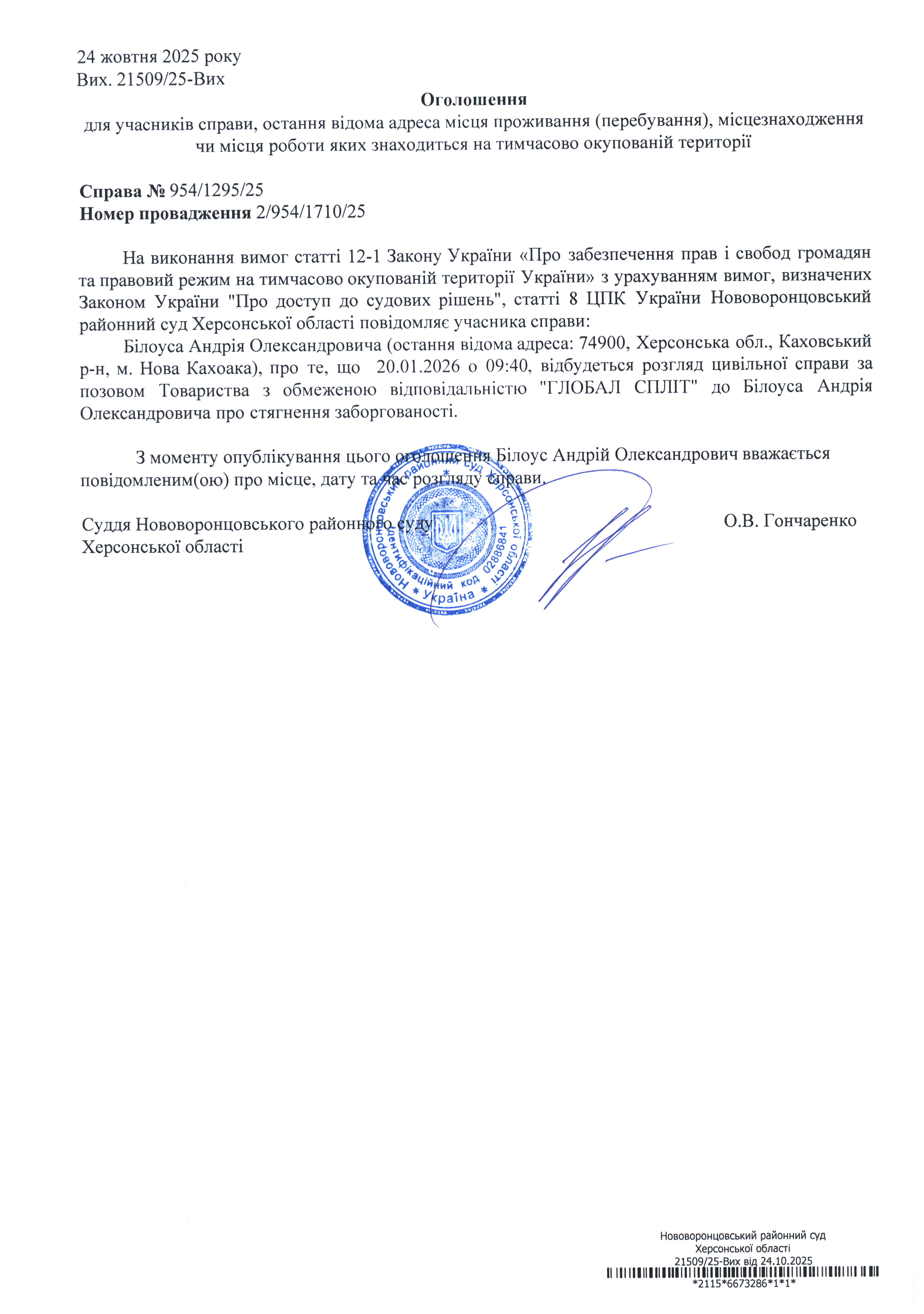 До суду викликається Білоус Андрій Олександрович на 9 год. 40 хв. 20 січня 2026 року