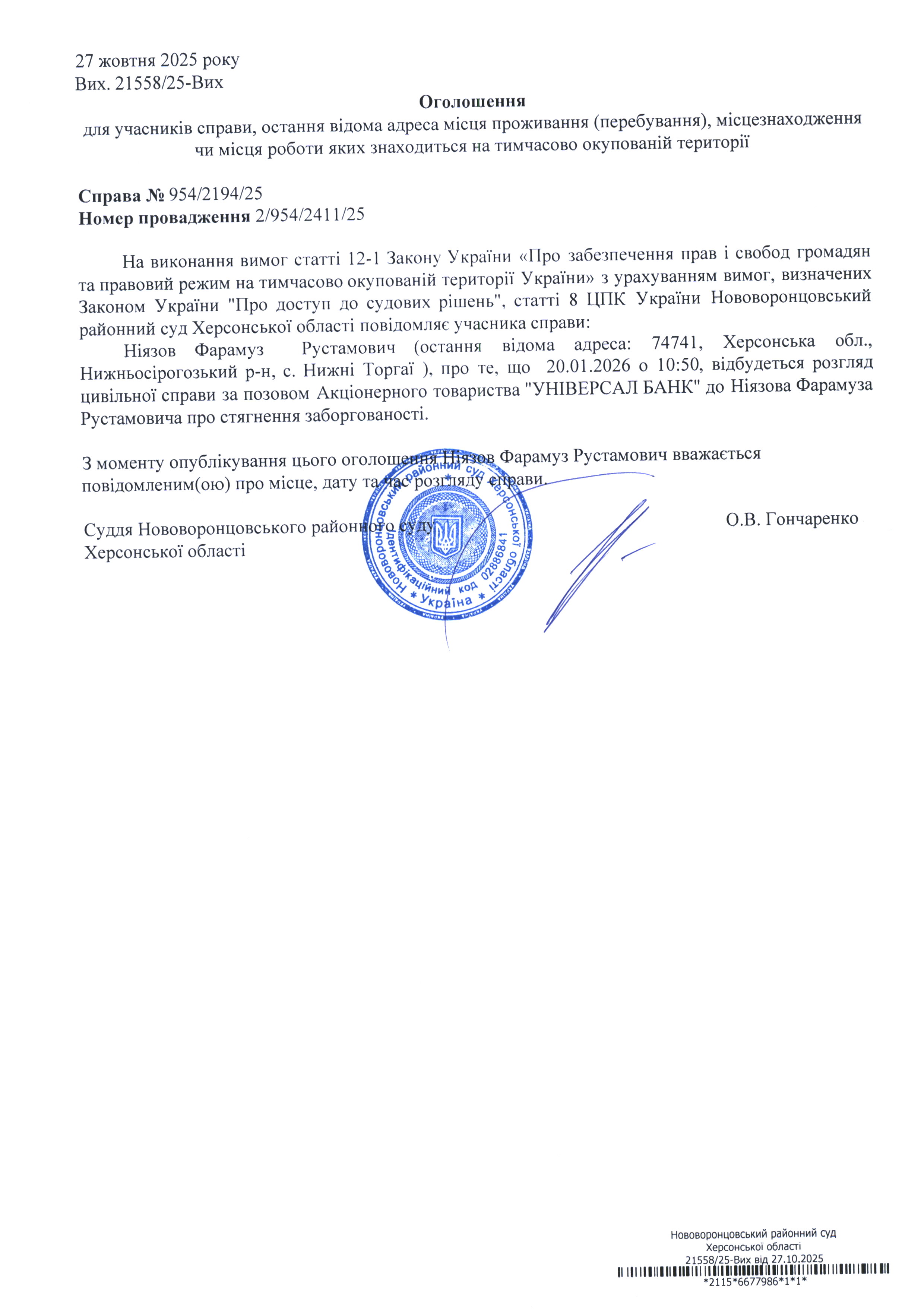 До суду викликається Ніязов Фарамуз Рустамович на 10 год. 50 хв. 20 січня 2026 року