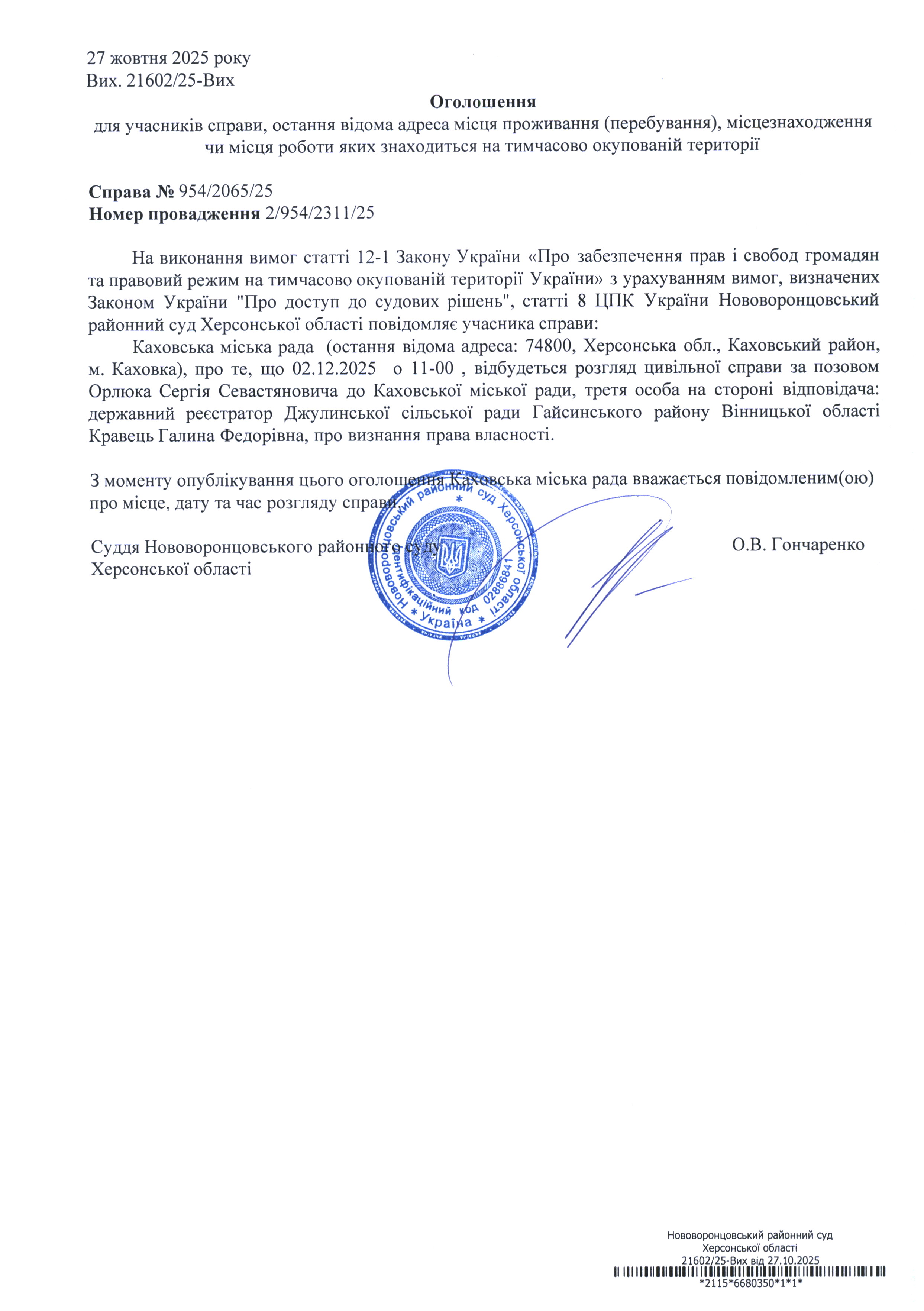 До суду викликається Каховська міська рада на 11 год. 00 хв. 2 грудня 2025 року