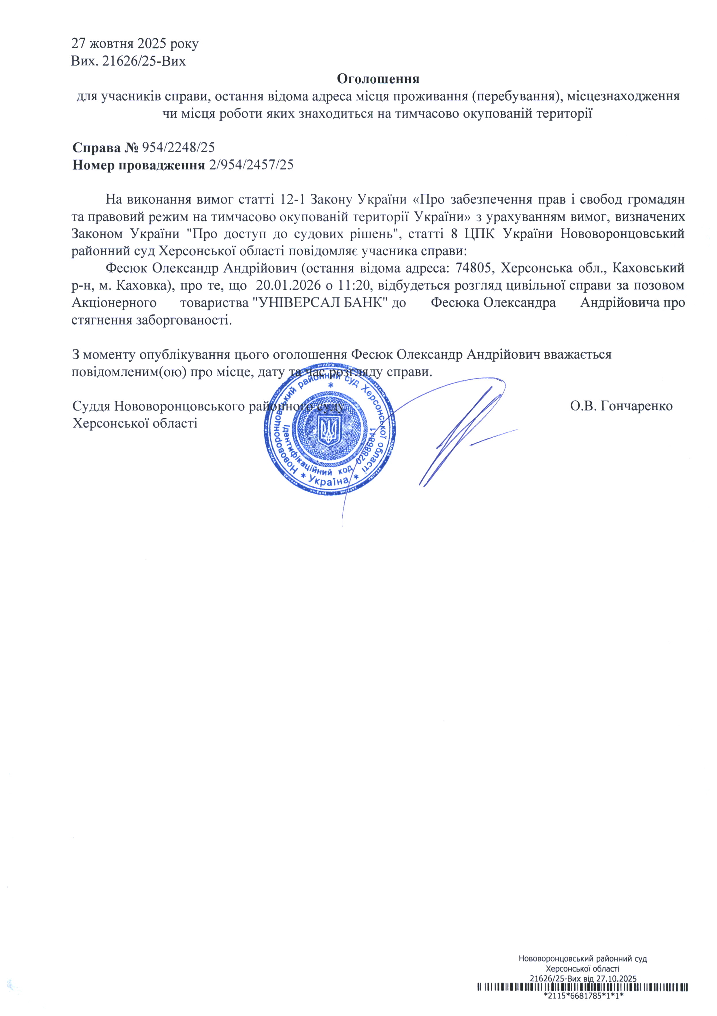 До суду викликається Фесюк Олександр Андрійович на 11 год. 20 хв. 20 січня 2026 року