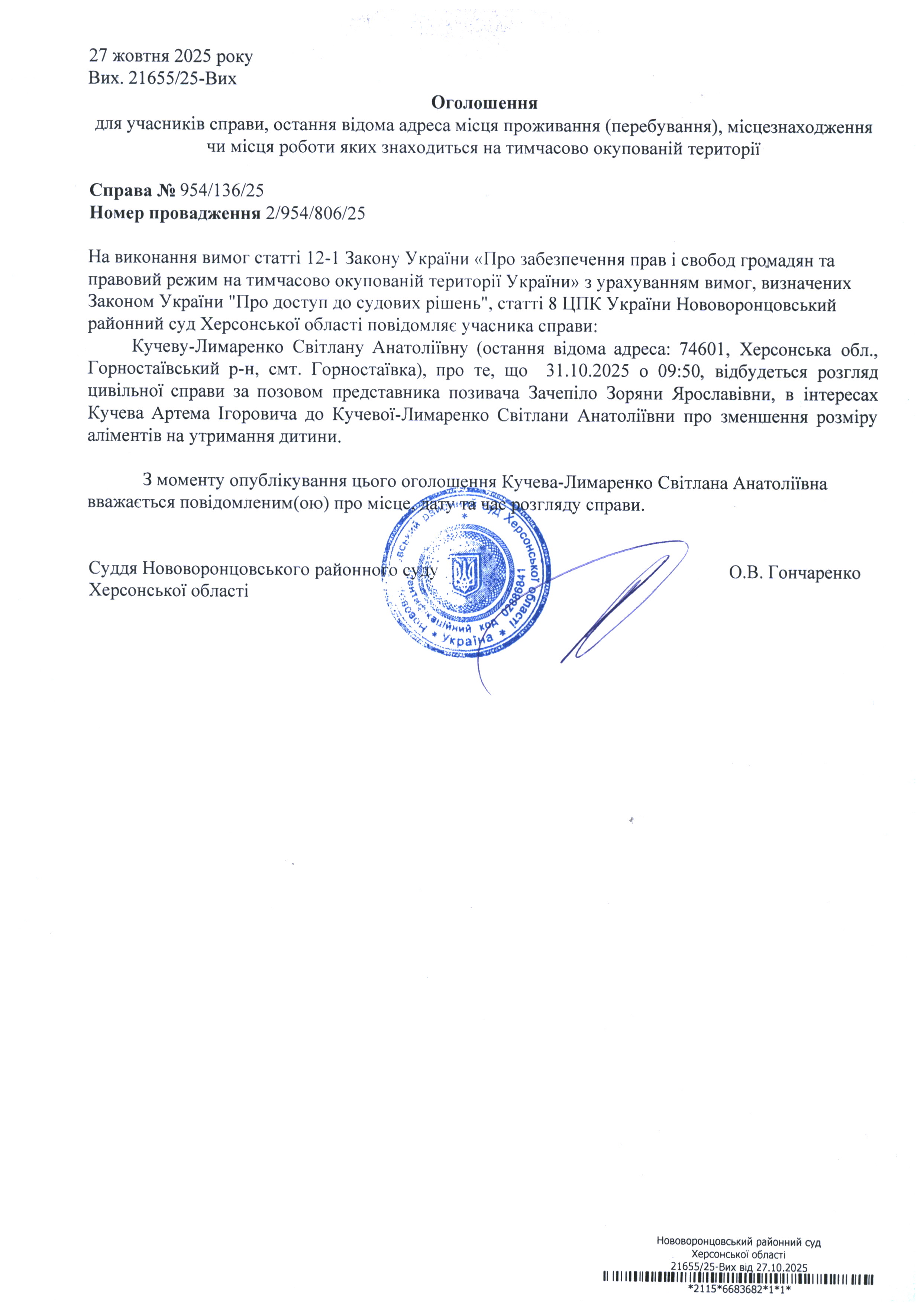 До суду викликається Кучева-Лимаренко Світлана Анатоліївна на 9 год. 50 хв. 31 жовтня 2025 року