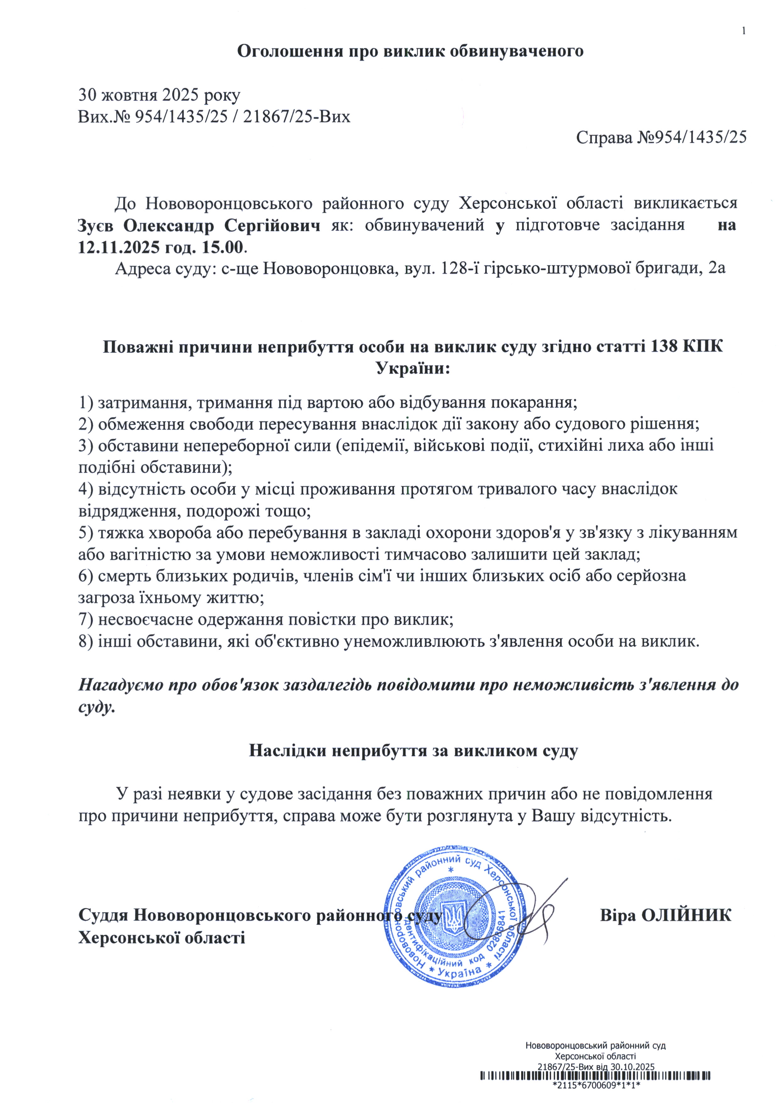 До суду викликається Зуєв Олександр Сергійович на 15 год. 00 хв. 12 листопада 2025 року
