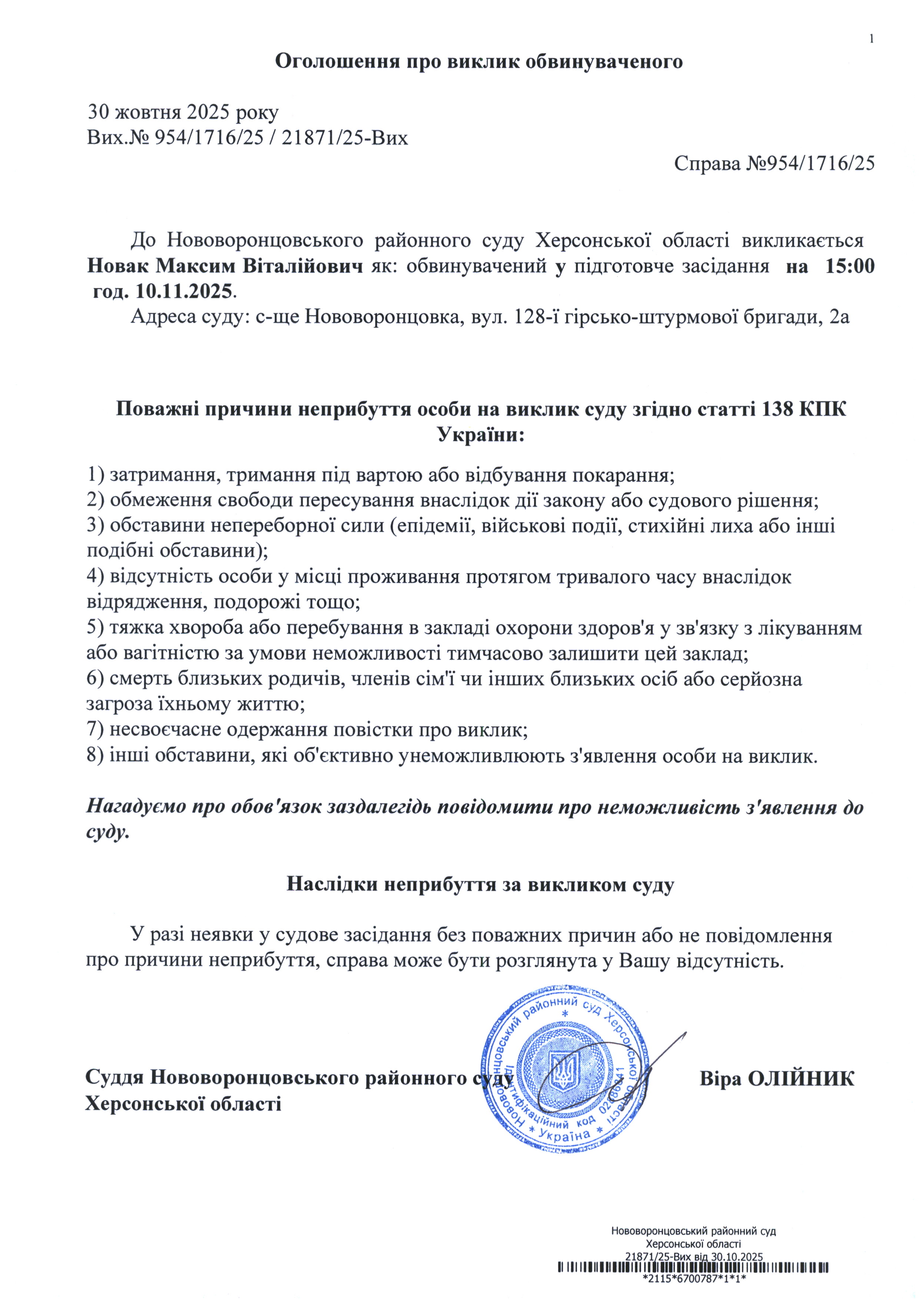 До суду викликається Новак Максим Віталійович на 15 год. 00 хв. 10 листопада 2025 року