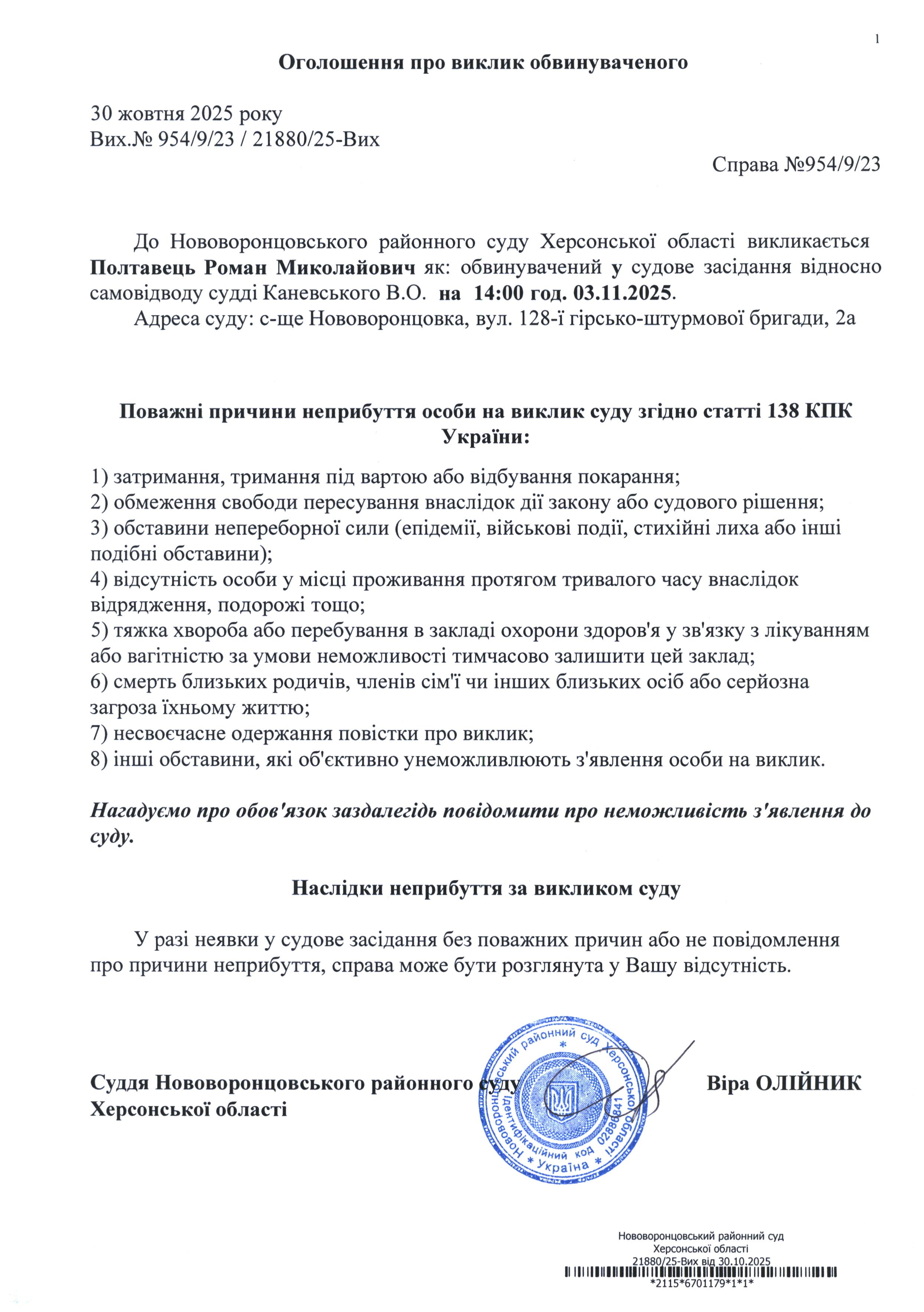 До суду викликається Полтавець Роман Миколайович на 14 год. 00 хв. 3 листопада 2025 року