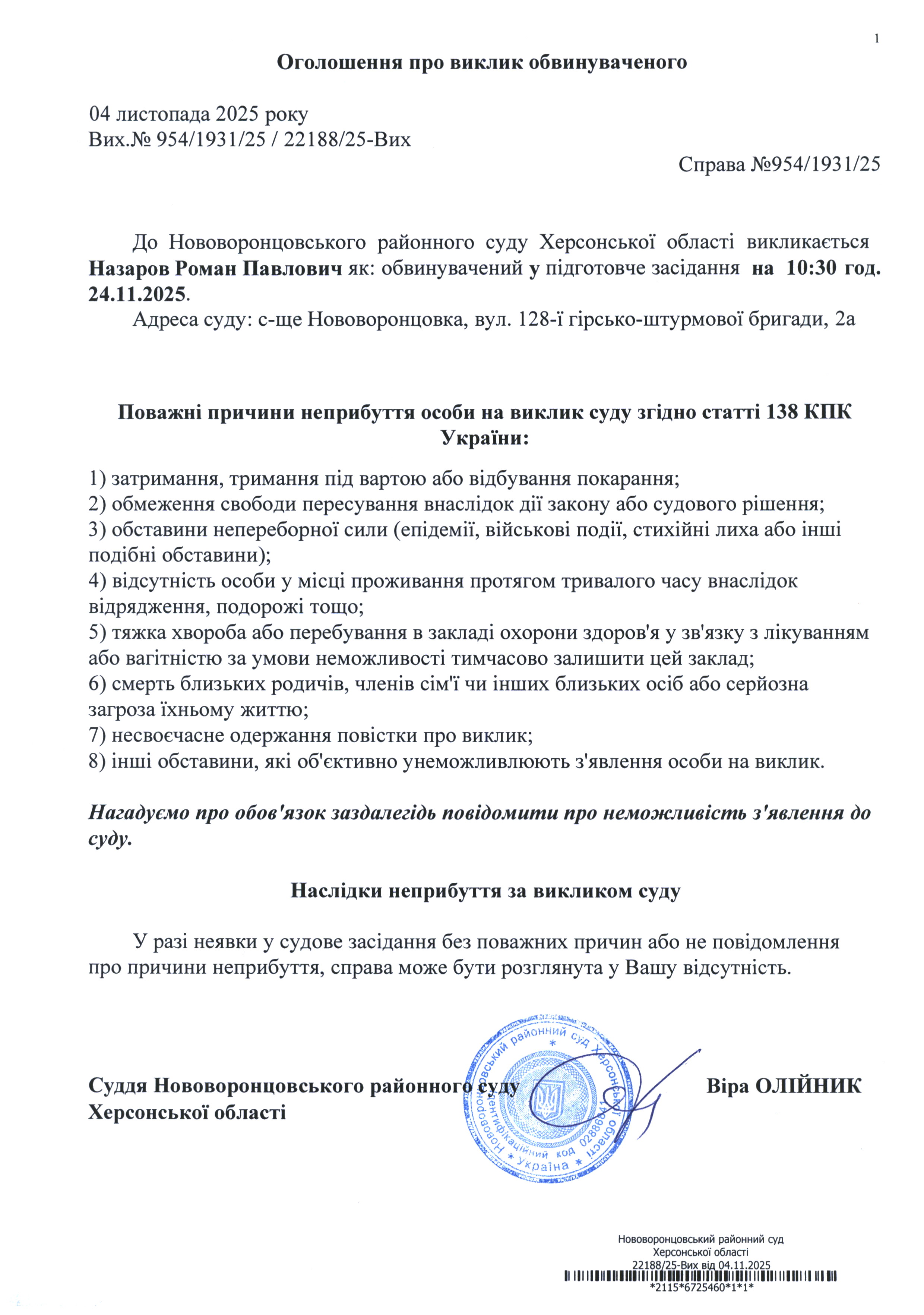 До суду викликається Назаров Роман Павлович на 10 год. 30 хв. 24 листопада 2025 року
