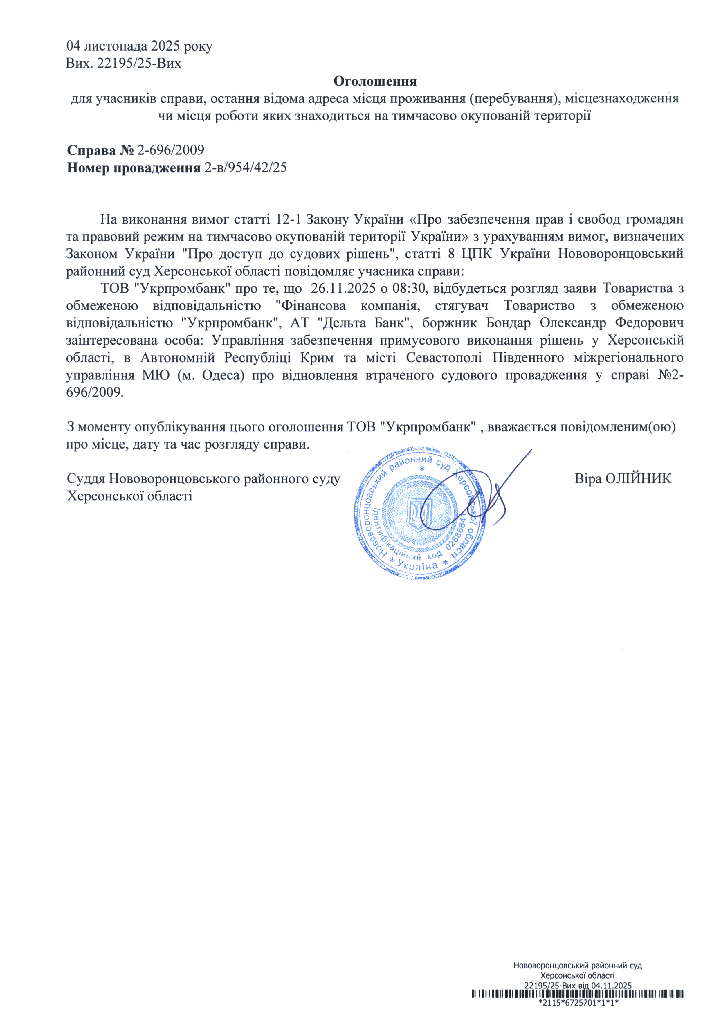 До суду викликається ТОВ "Укрпромбанк" на 8 год. 30 хв. 26 листопада 2025 року