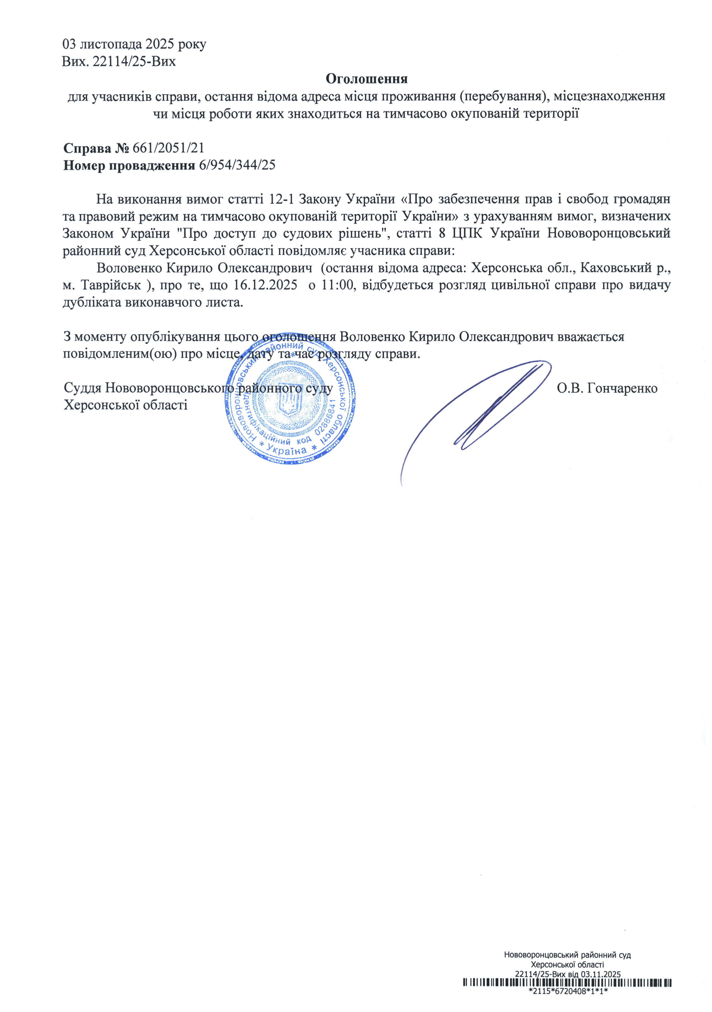 До суду викликається Воловенко Кирило Олександрович на 11 год. 00 хв. 16 грудня 2025 року