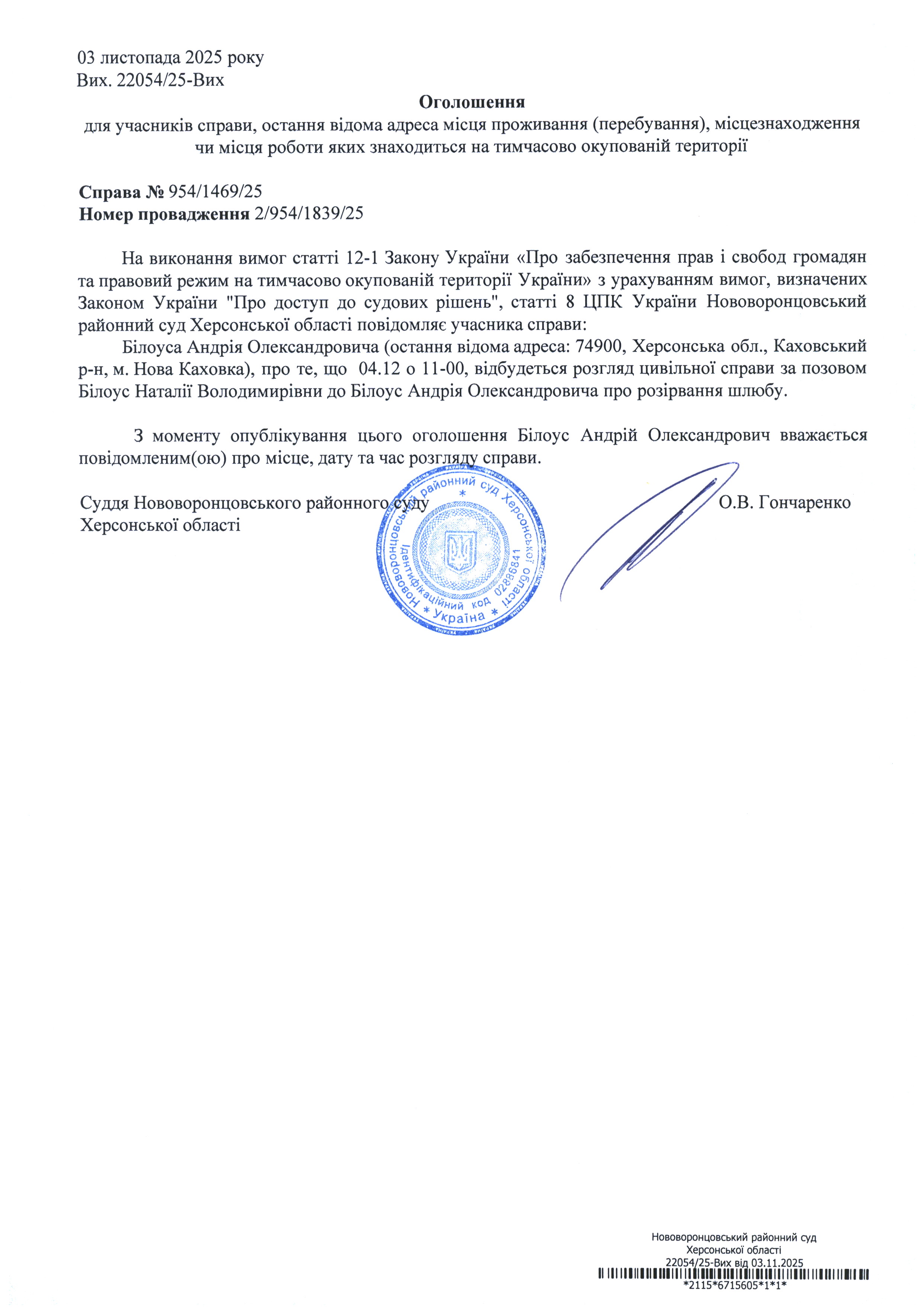 До суду викликається Білоус Андрій Олександрович на 11 год. 00 хв. 4 грудня 2025 року