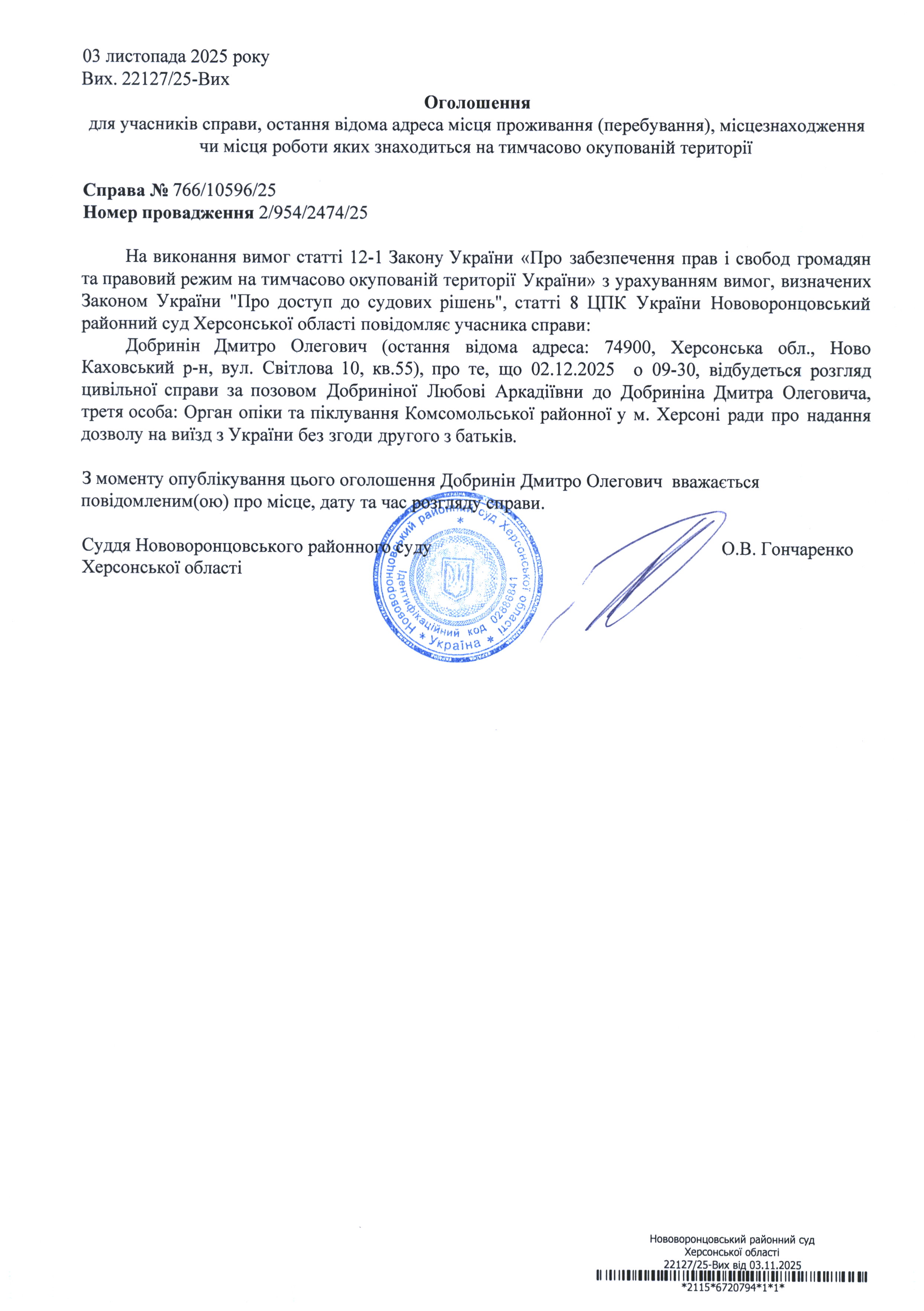 До суду викликається Добринін Дмитро Олегович на 9 год. 30 хв. 2 грудня 2025 року