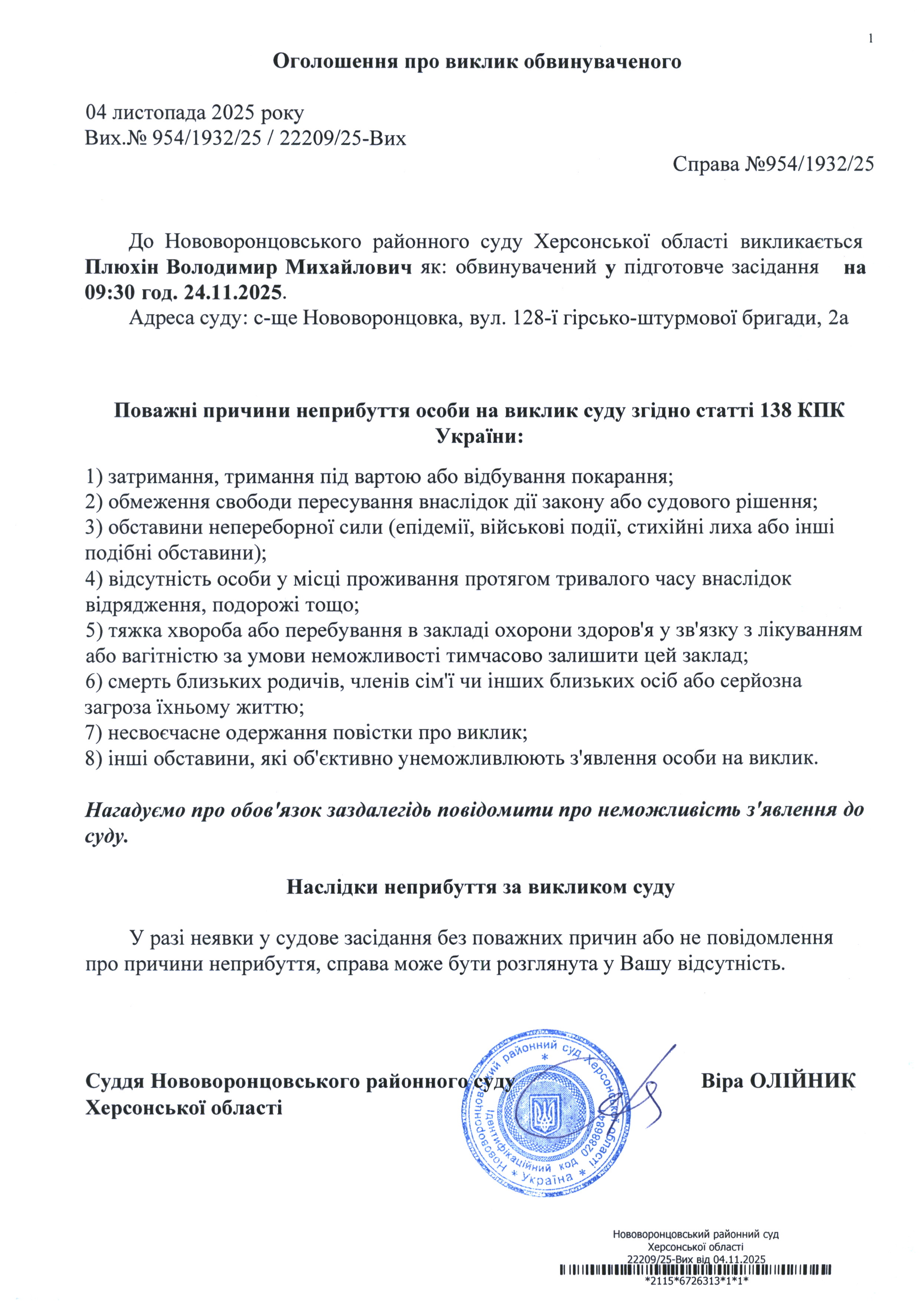 До суду викликається Плюхін Володимир Михайлович на 9 год. 30 хв. 24 листопада 2025 року