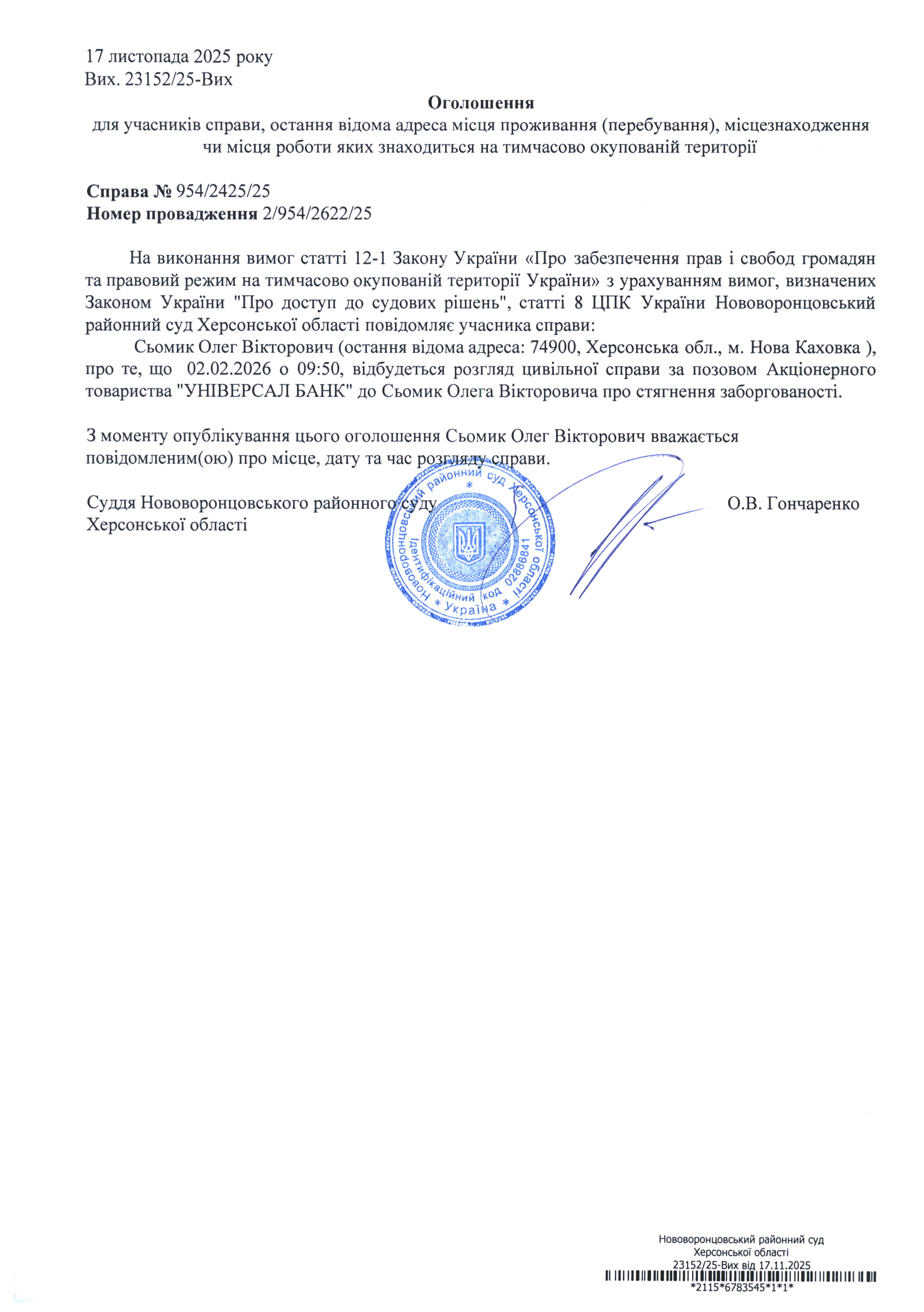 До суду викликається Сьомик Олег Вікторович на 9 год. 50 хв. 2 лютого 2026 року