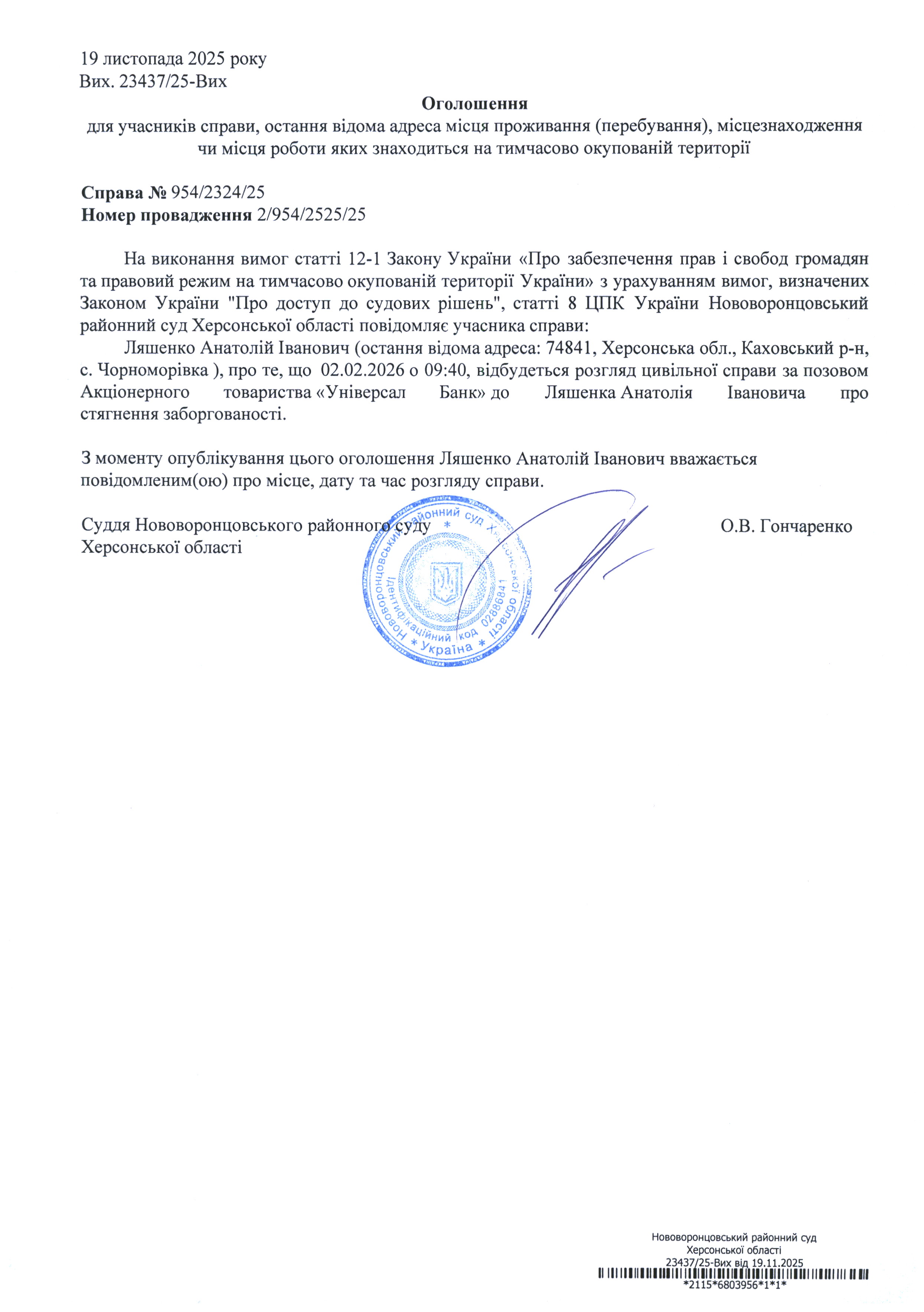 До суду викликається Ляшенко Анатолій Іванович на 9 год. 40 хв. 2 лютого 2026 року