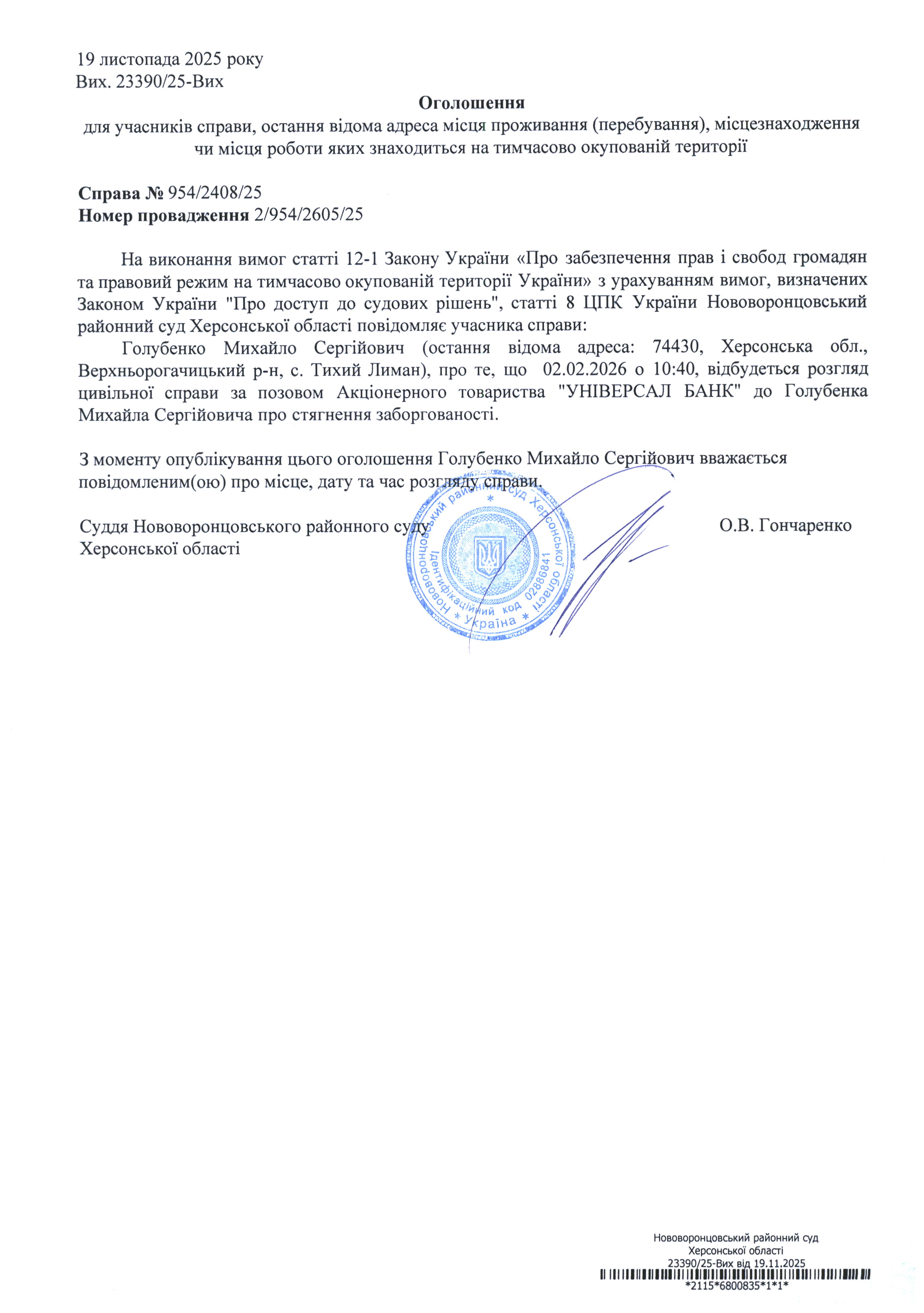 До суду викликається Голубенко Михайло Сергійович на 10 год. 40 хв. 2 лютого 2026 року