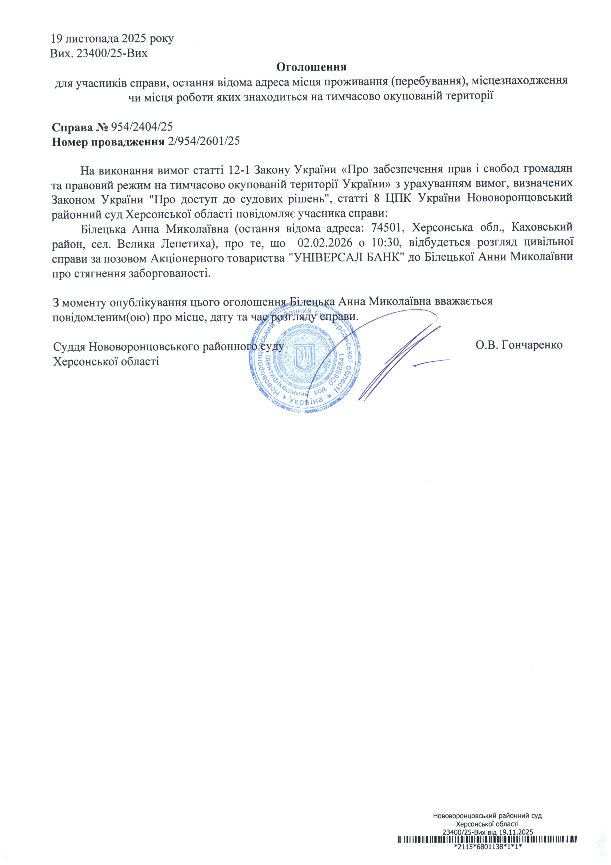 До суду викликається Білецька Анна Миколаївна на 10 год. 30 хв. 2 лютого 2026 року