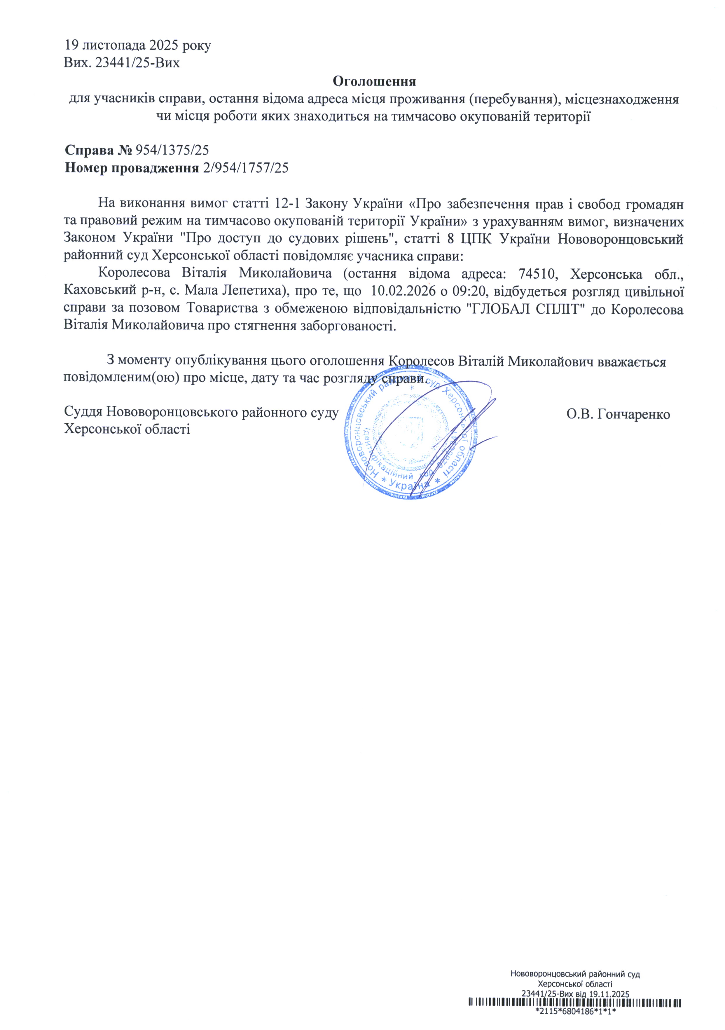 До суду викликається Королесов Віталій Миколайович на 9 год. 20 хв. 10 лютого 2026 року