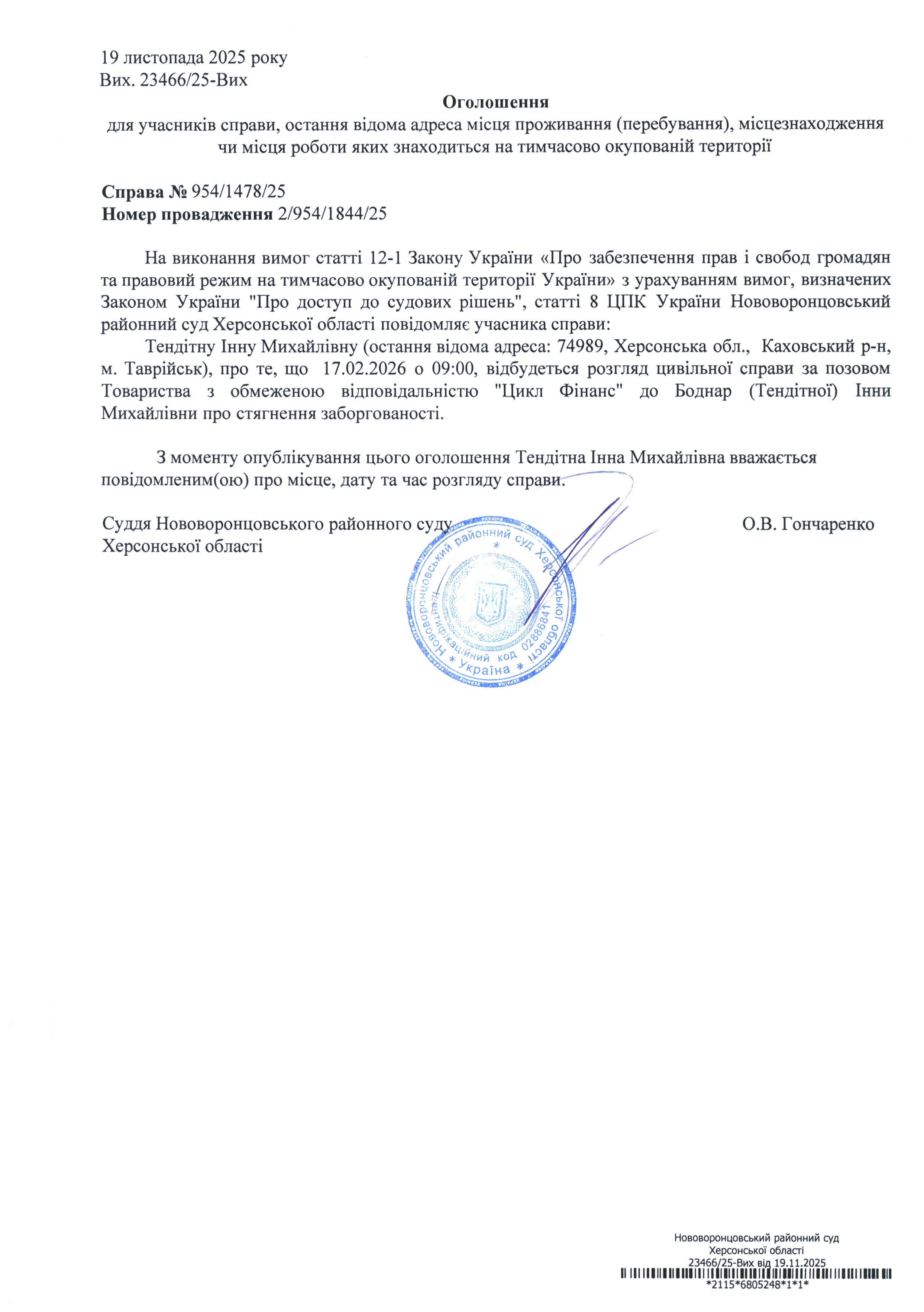 До суду викликається Тендітна Інна Михайлівна на 9 год. 00 хв. 17 лютого 2026 року