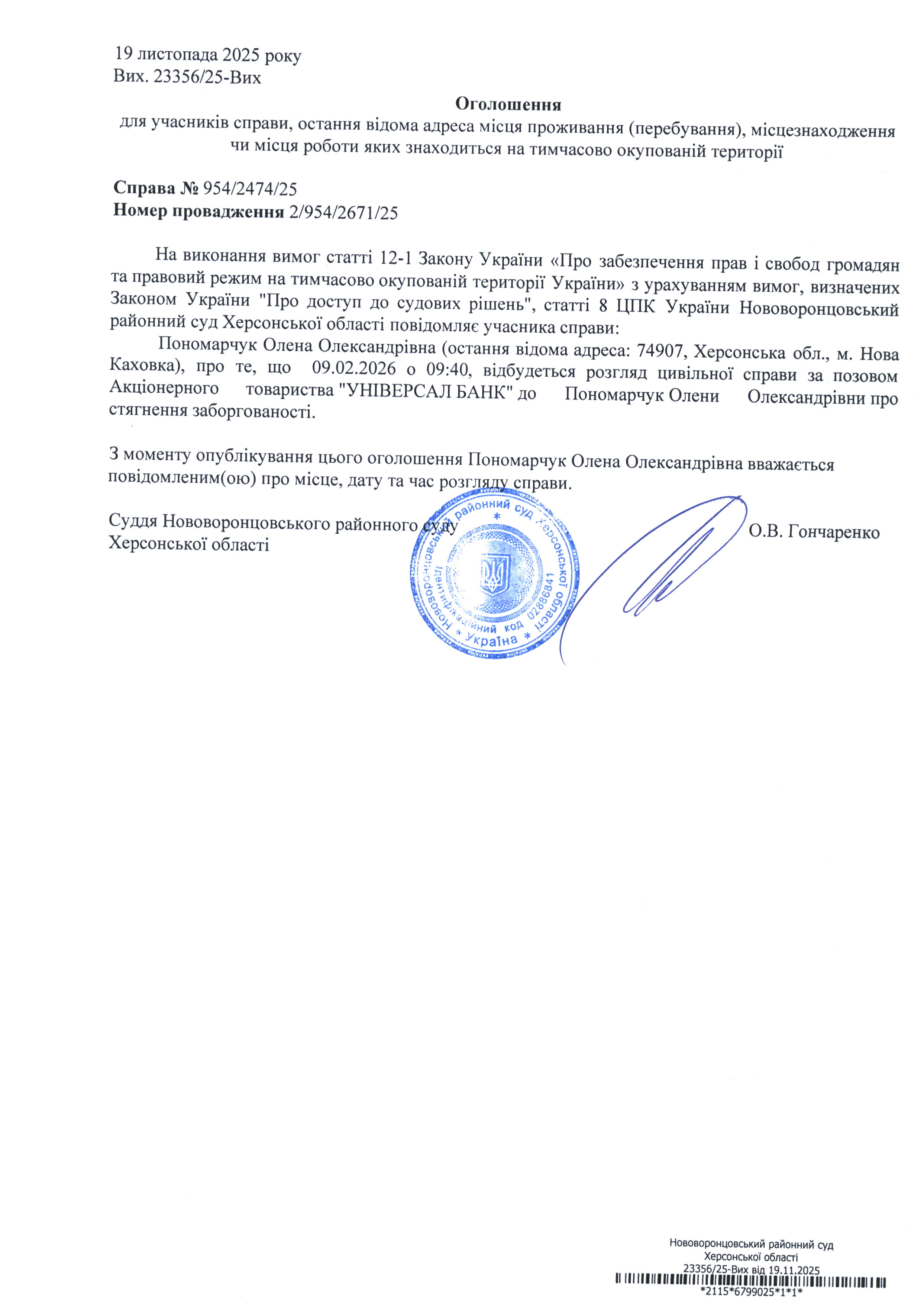 До суду викликається Пономарчук Олена Олександрівна на 9 год. 40 хв. 9 лютого 2026 року