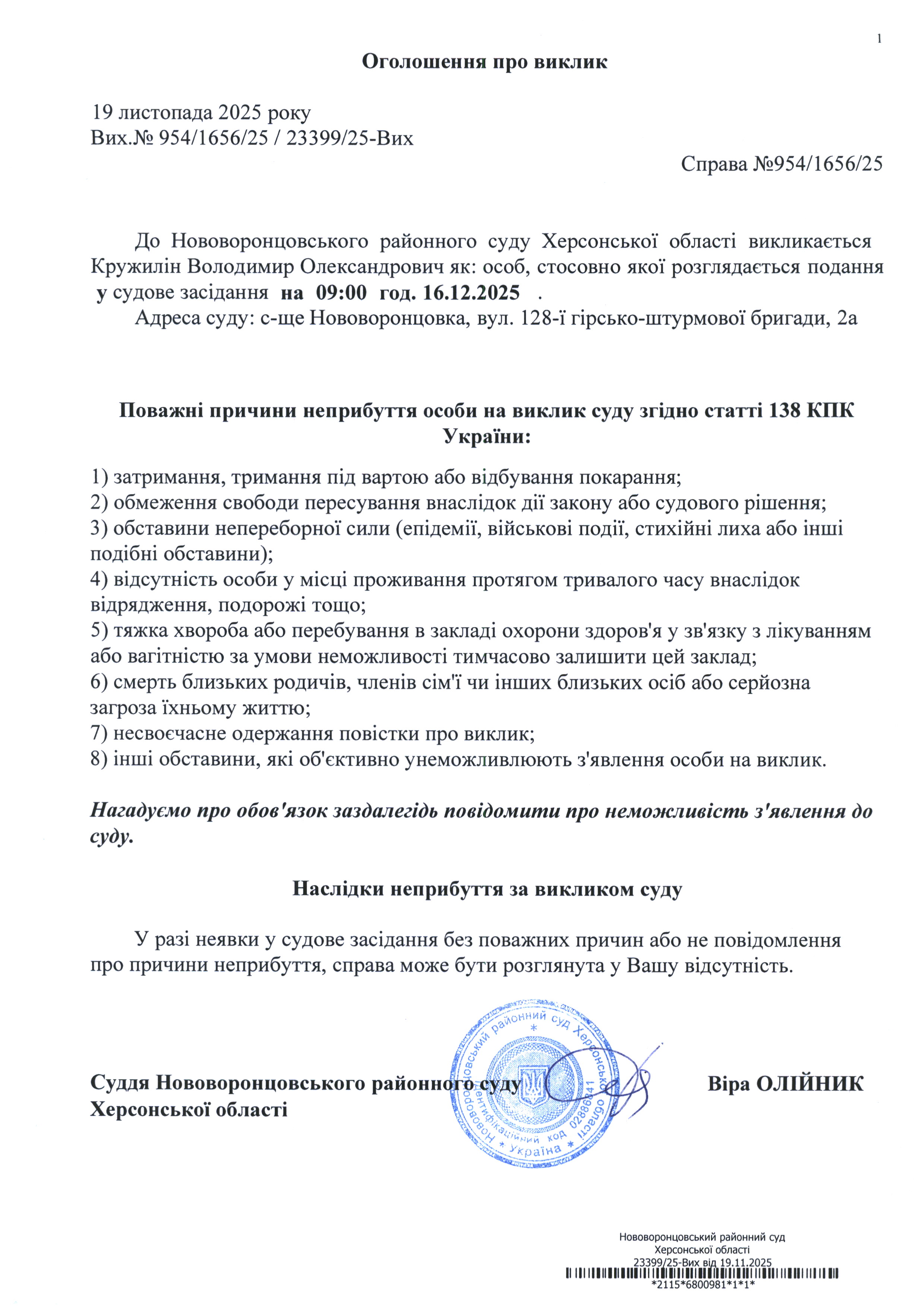 До суду викликається Кружилін Володимир Олександрович на 9 год. 00 хв. 16 грудня 2025 року