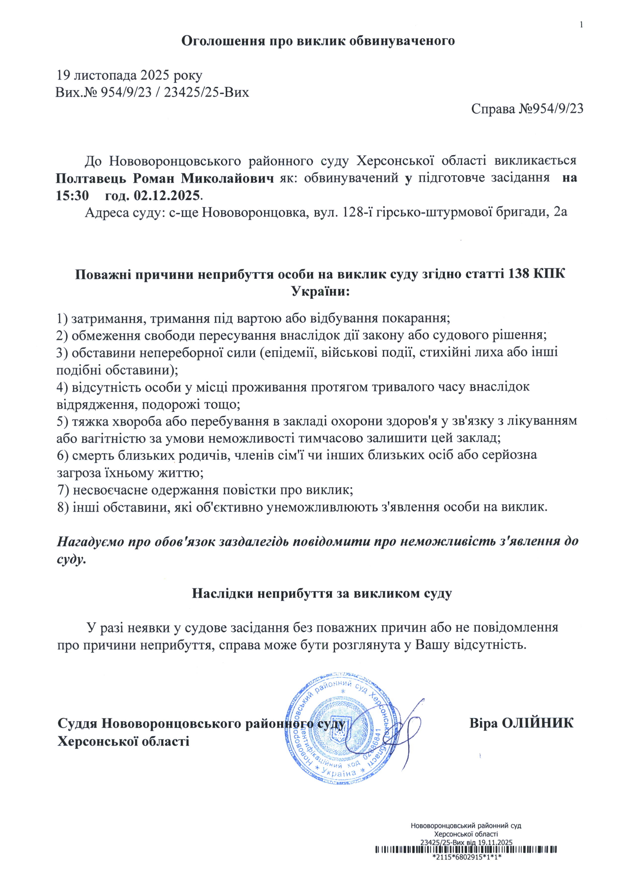 До суду викликається Полтавець Романд Миколайович на 15 год. 30 хв. 2 грудня 2025 року