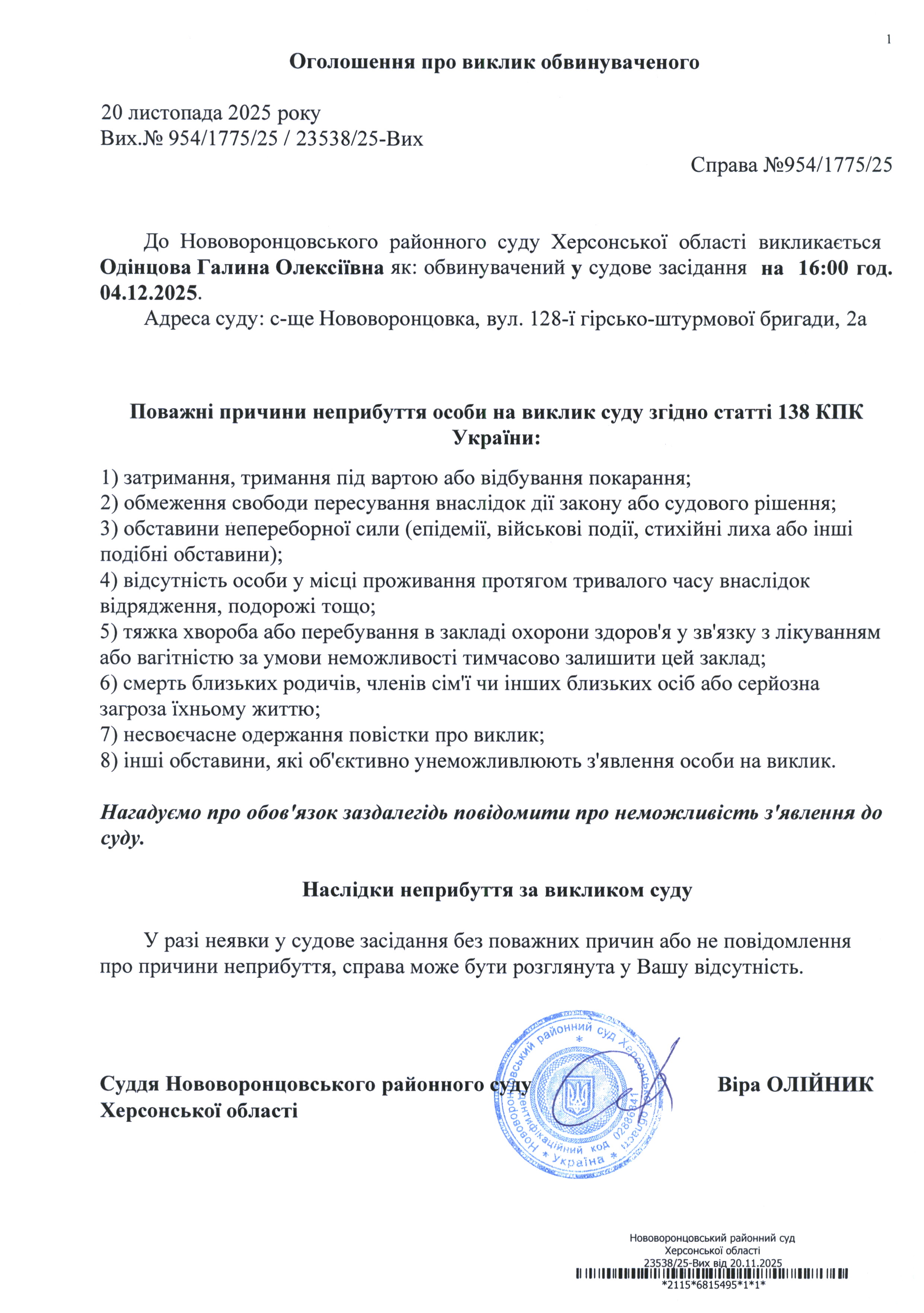До суду викликається Одінцова Галина Олексіївна на 16 год. 00 хв. 4 грудня 2025 року