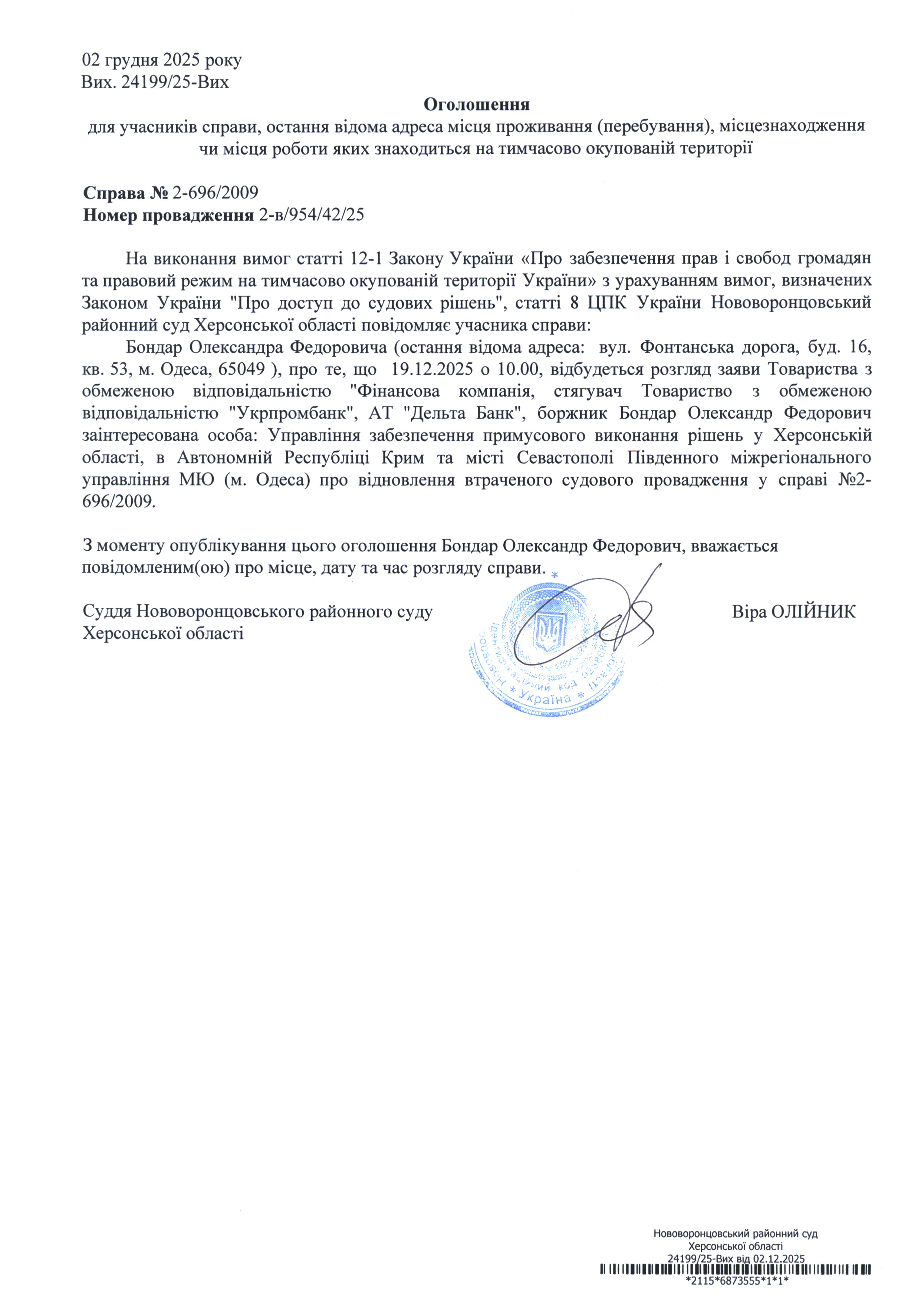 До суду викликається Бондар Олександр Федорович на 10 год. 00 хв. 19 грудня 2025 року