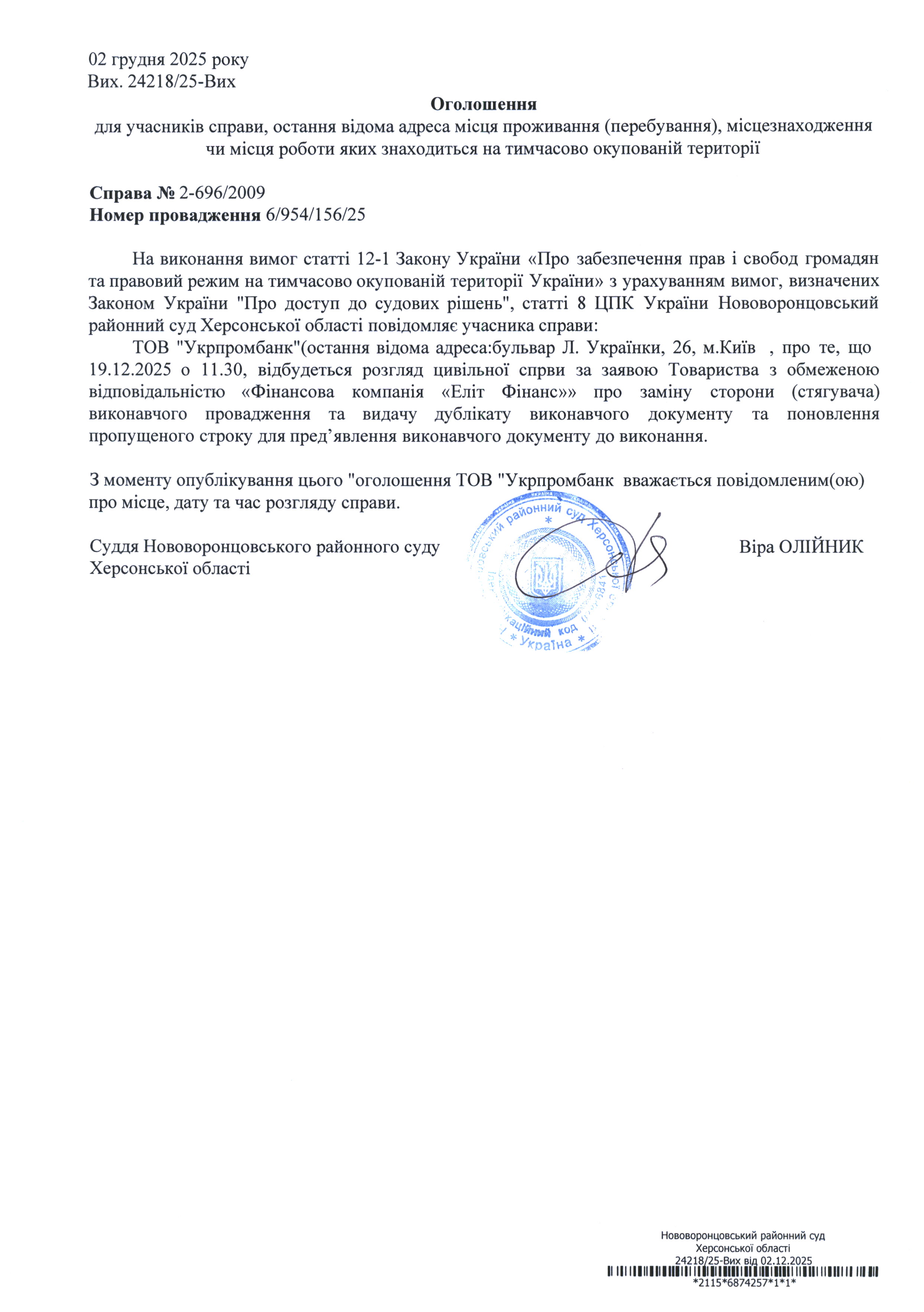 До суду викликається ТОВ "Укрпромбанк" на 11 год. 30 хв. 19 грудня 2025 року