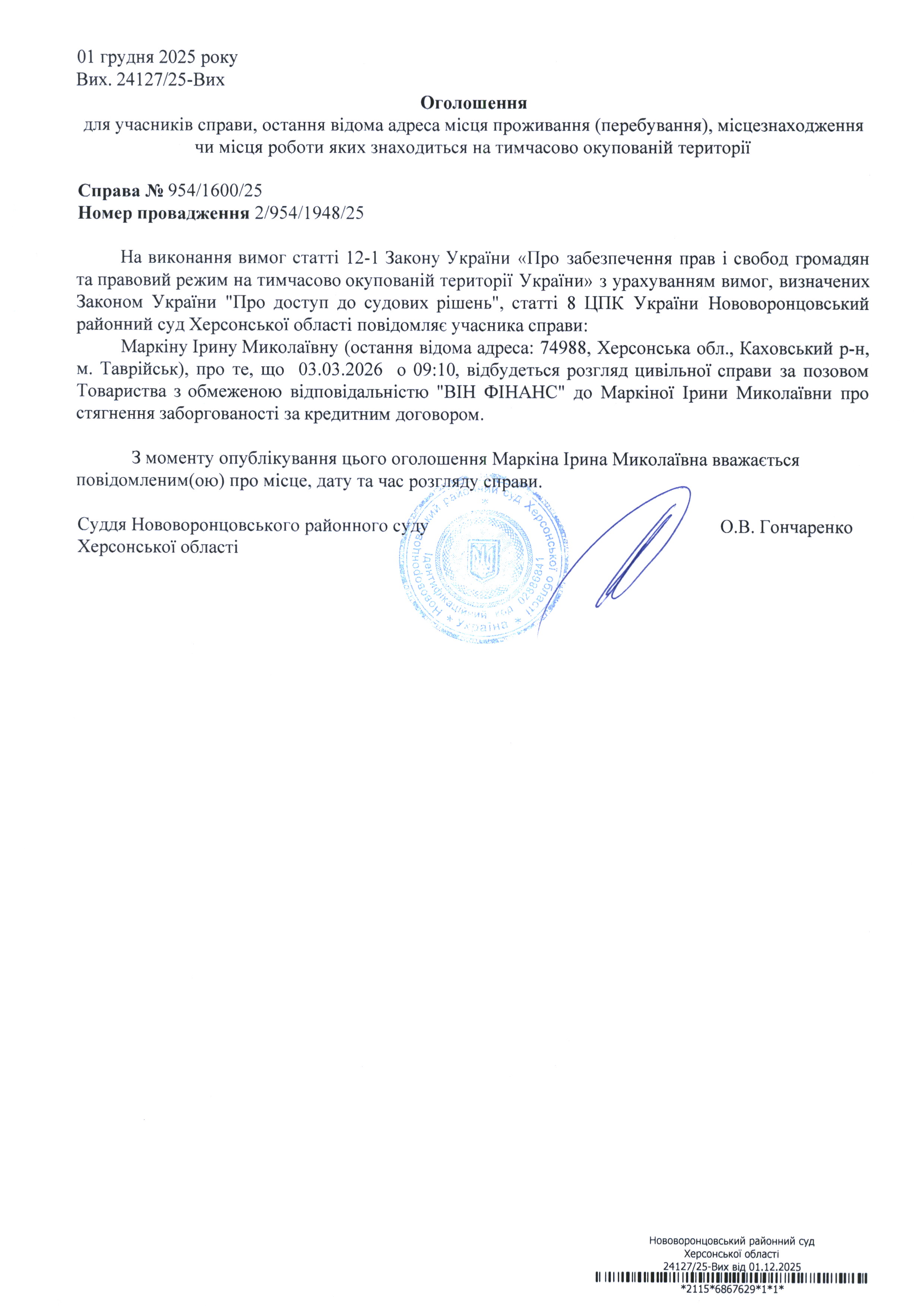 До суду викликається Маркіна Ірина Миколаївна на 9 год. 10 хв. 3 березня 2026 року