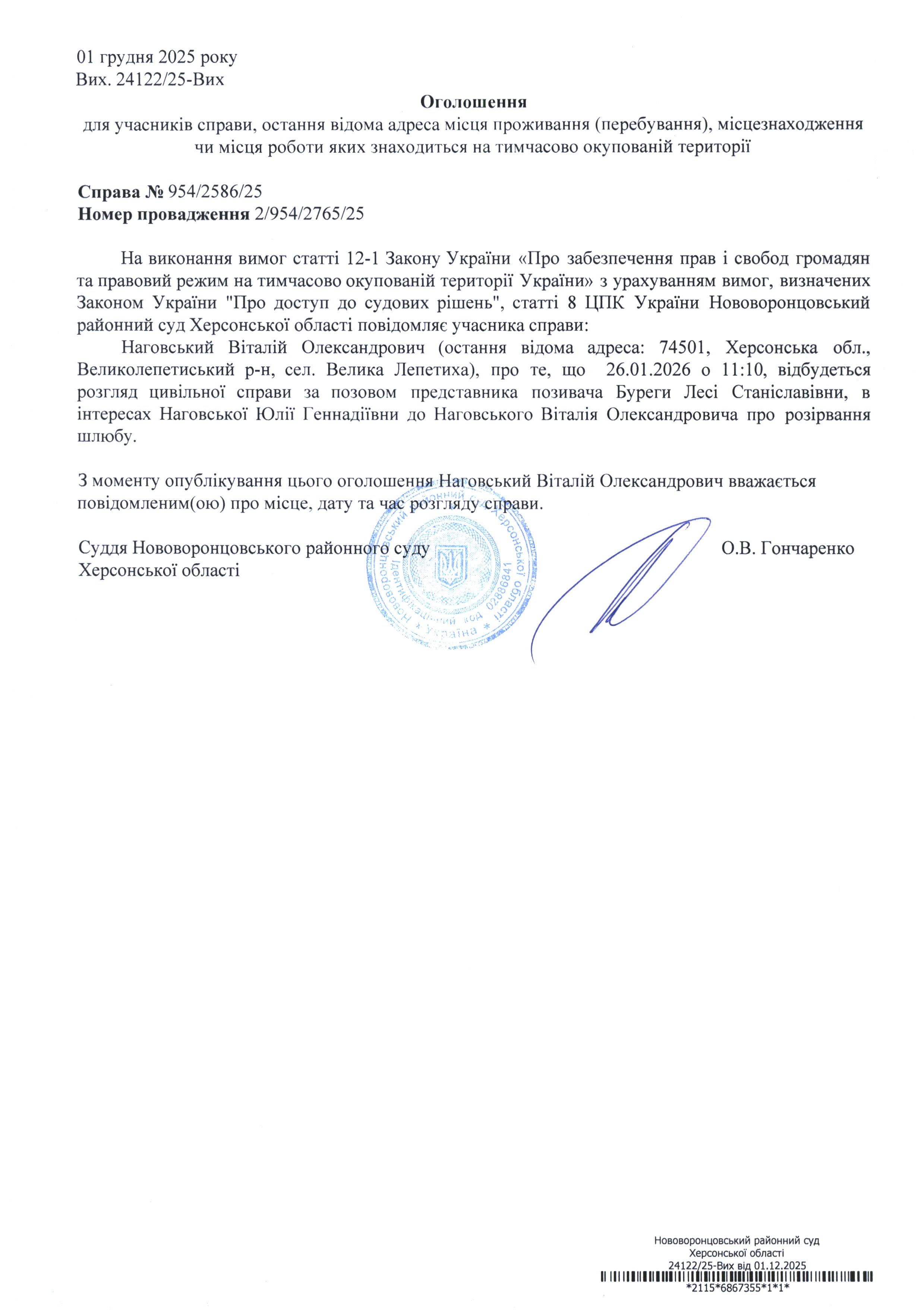 До суду викликається Наговський Віталій Олександрович на 11 год. 10 хв. 26 січня 2026 року