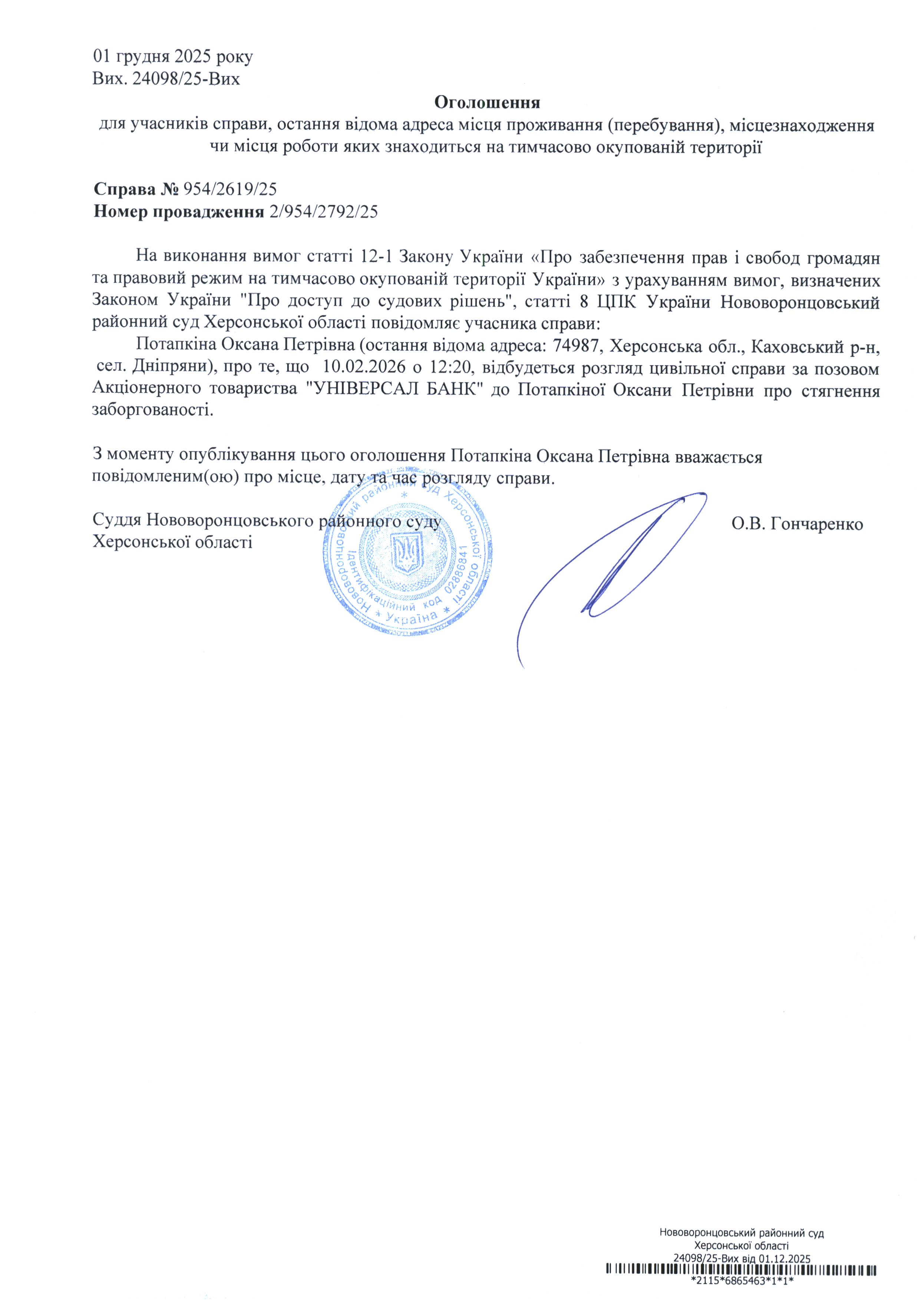 До суду викликається Потапкіна Оксана Петрівна на 12 год. 20 хв. 10 лютого 2026 року