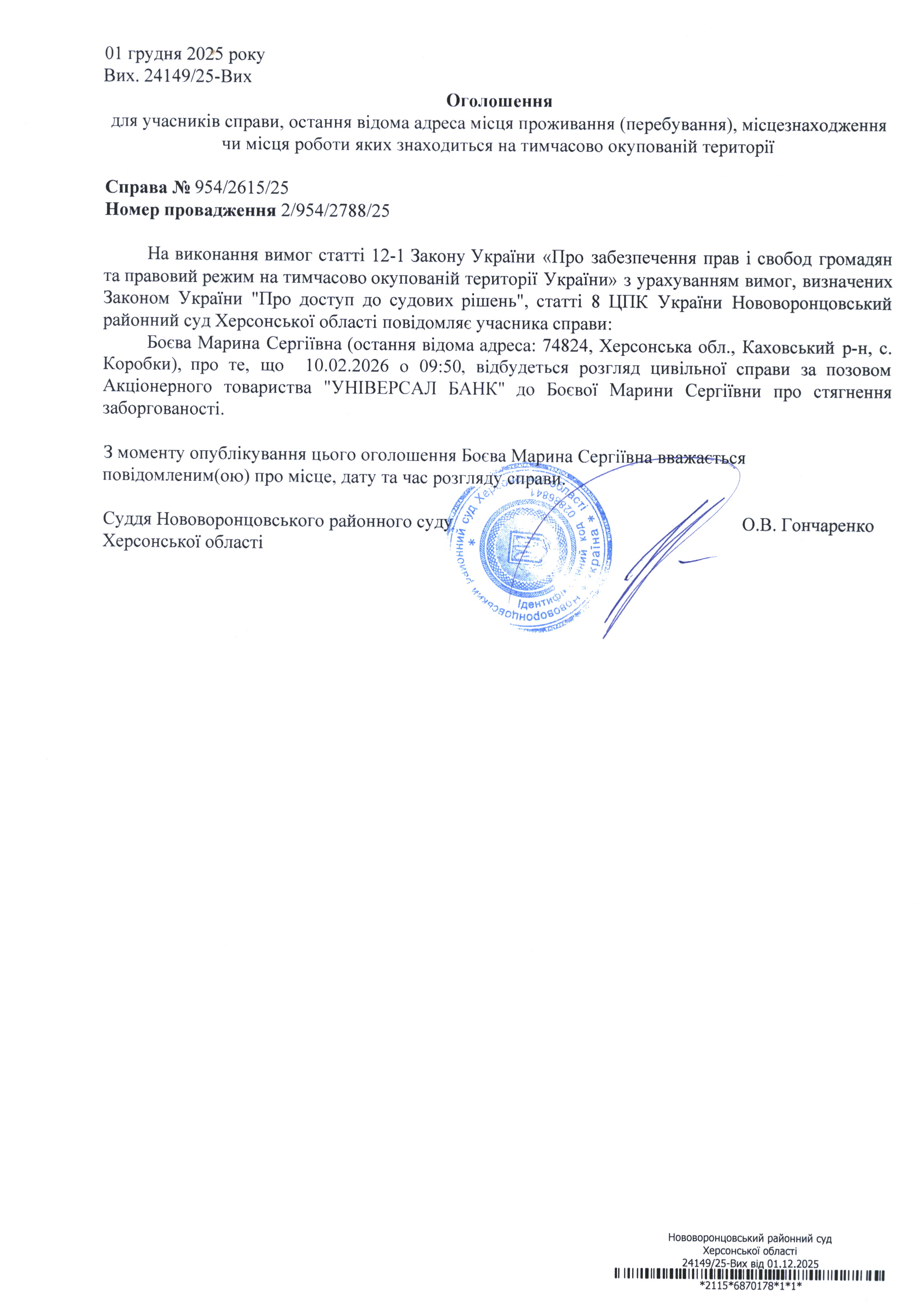 До суду викликається Боєва Марина Сергіївна на 9 год. 50 хв. 10 лютого 2026 року