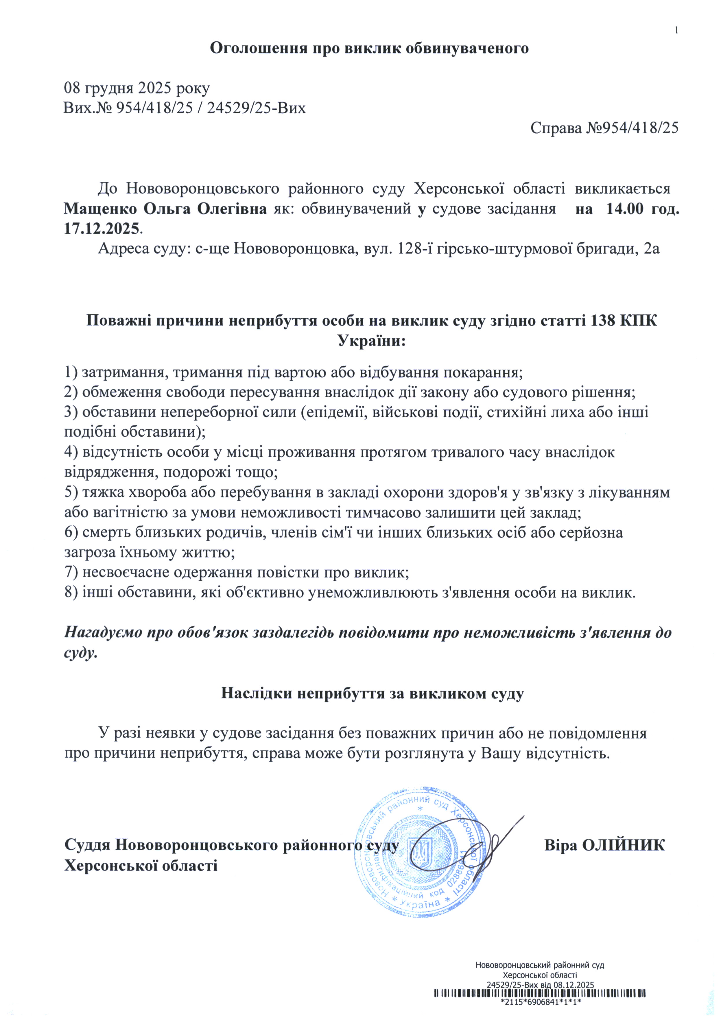 До суду викликається Мащенко Ольга Олегівна на 14 год. 00 хв. 17 грудня 2025 року