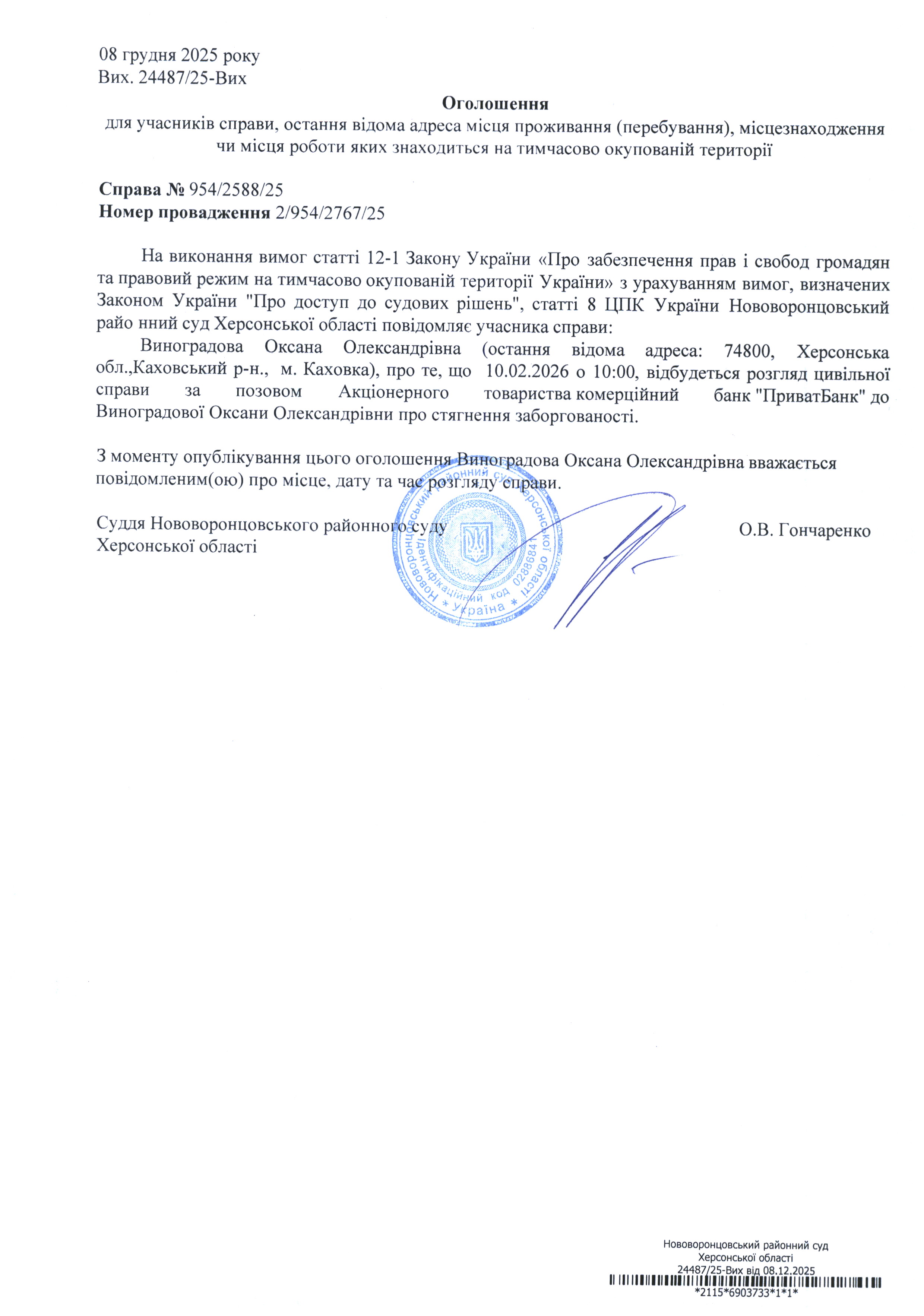До суду викликається Виноградова Оксана Олександрівна на 10 год. 00 хв. 10 лютого 2026 року