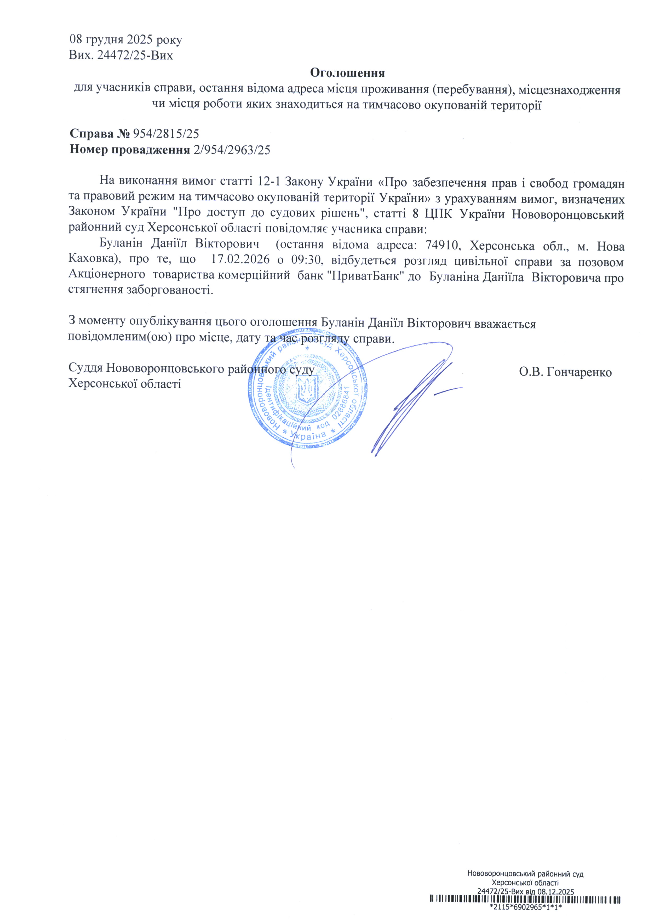 До суду викликається Буланін Даніїл Вікторович на 9 год. 30 хв. 17 лютого 2026 року