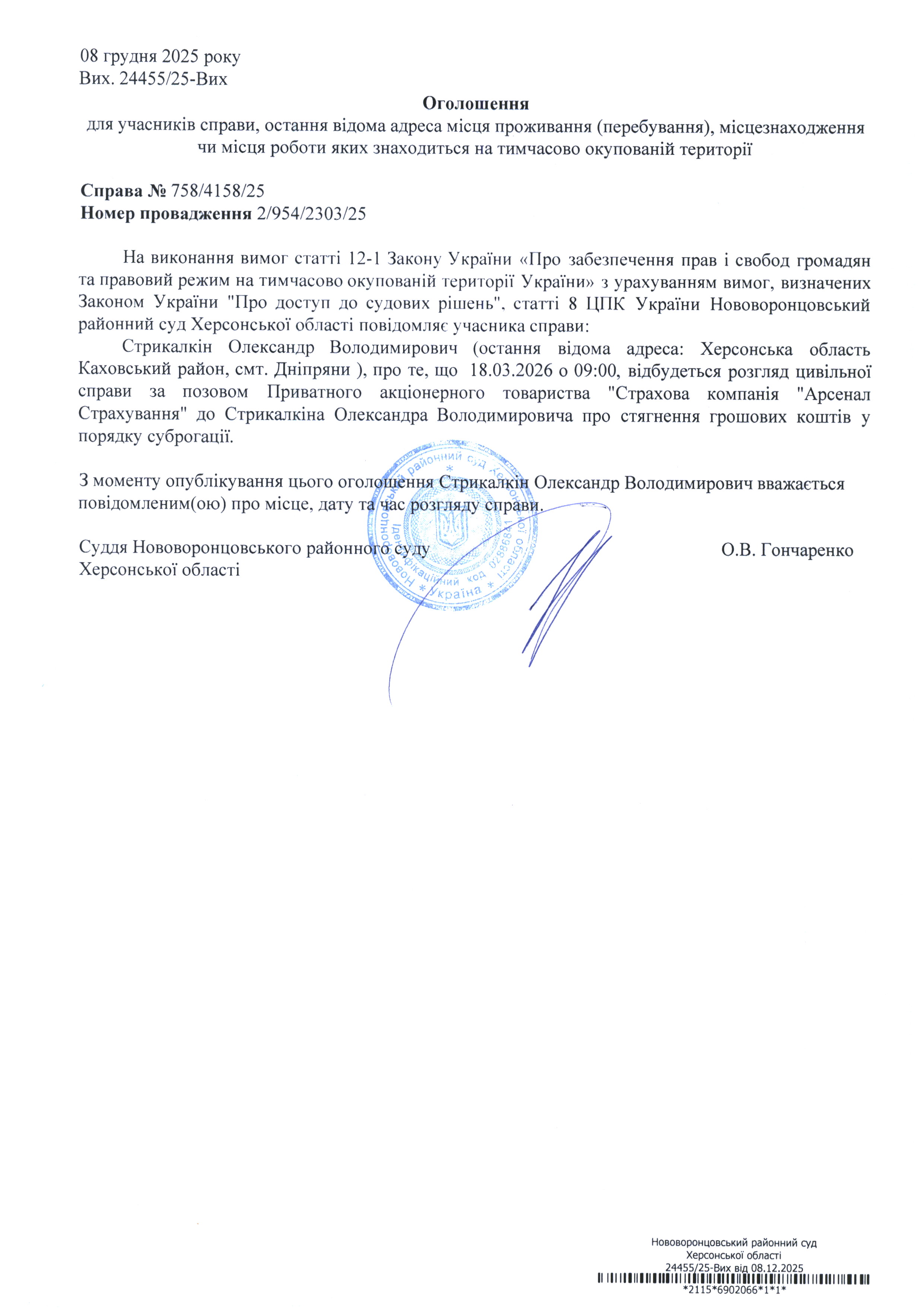 До суду викликається Стрикалкін Олександр Володимирович на 9 год. 00 хв. 18 березня 2026 року
