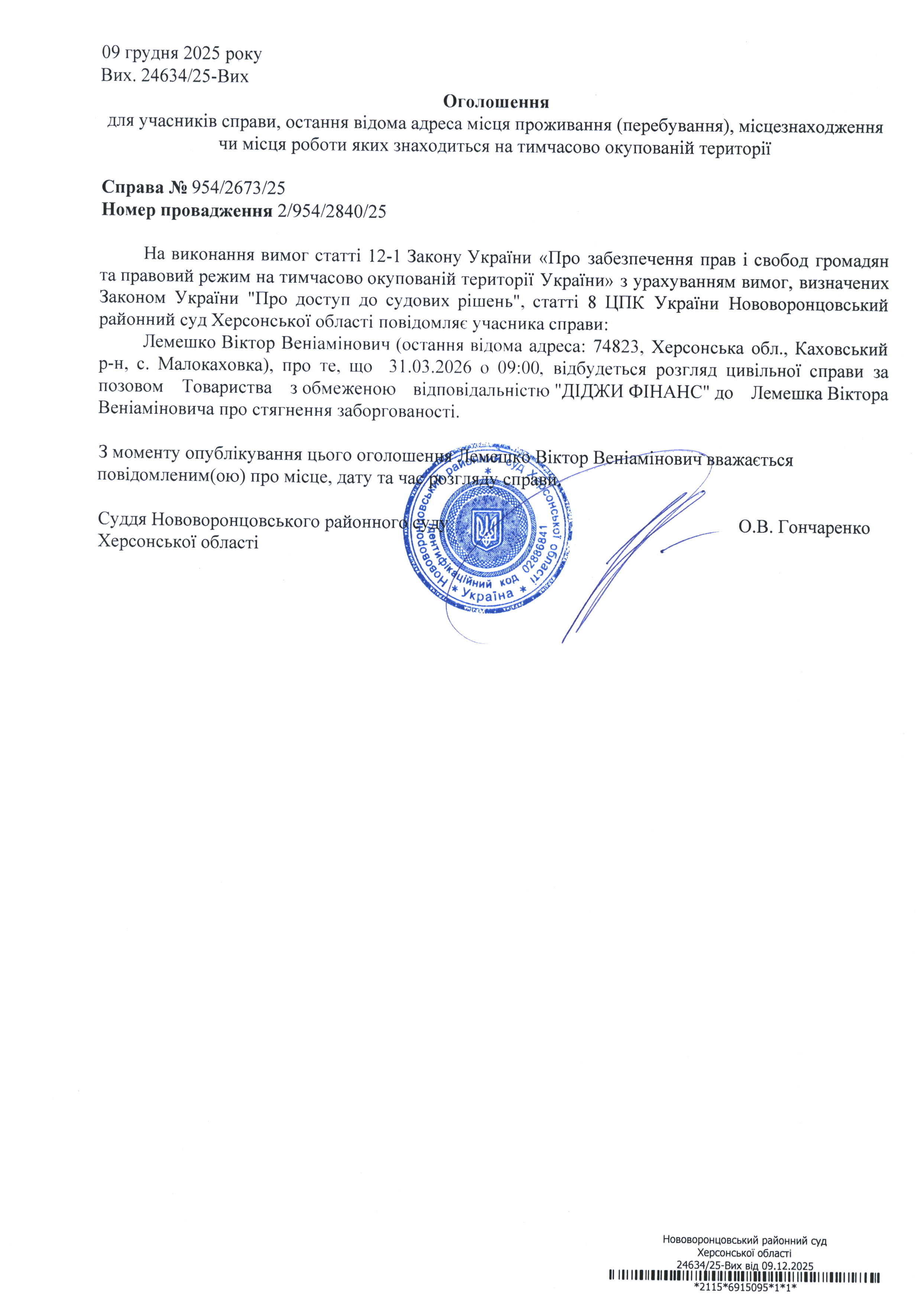 До суду викликається Лемешко Віктор Веніамінович на 9 год. 00 хв. 31 березня 2026 року