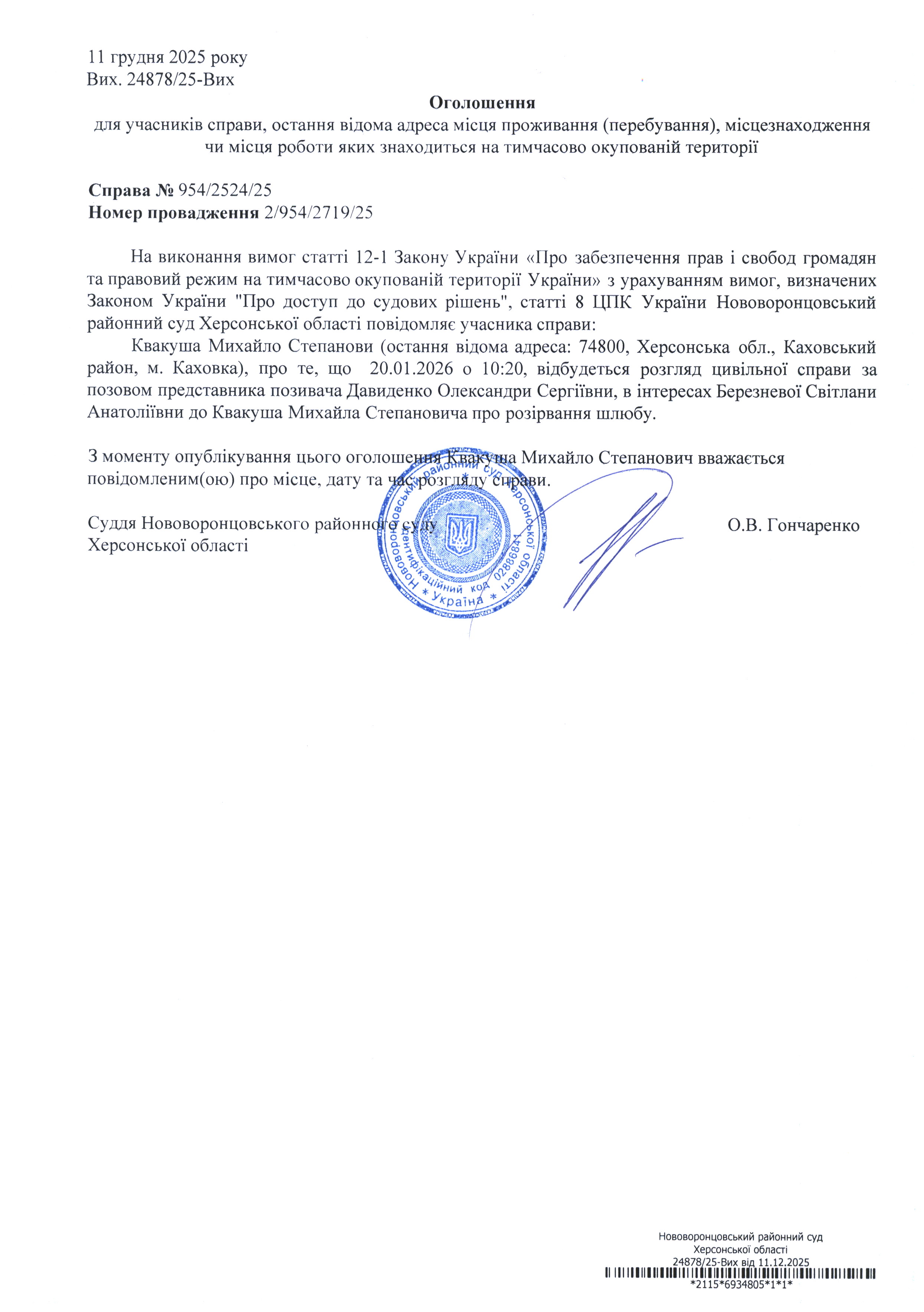 До суду викликається Квакуша Михайло Степанович на 10 год. 20 хв. 20 січня 2026 року