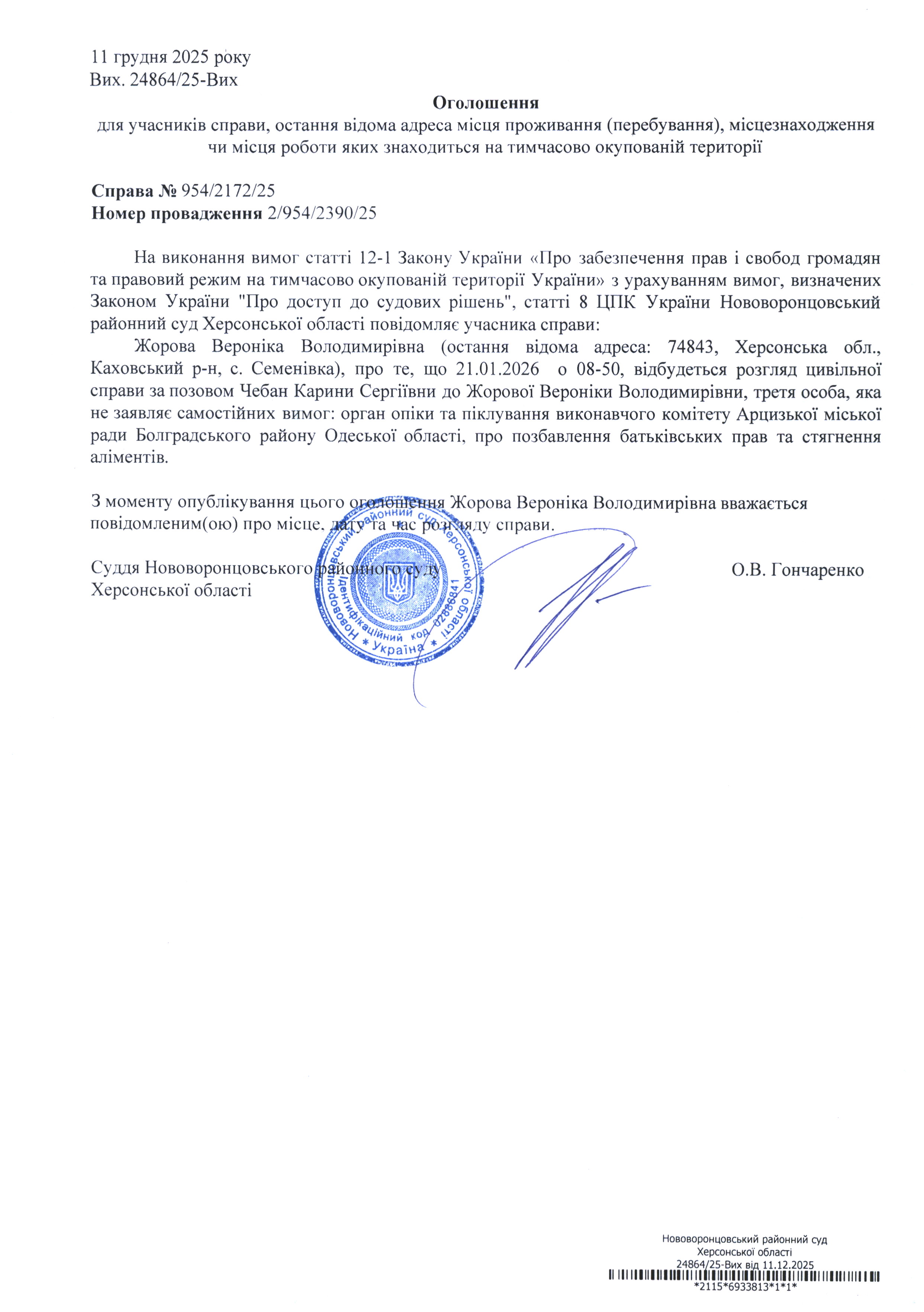 До суду викликається Жорова Вероніка Володимирівна на 8 год. 50 хв. 21 січня 2026 року