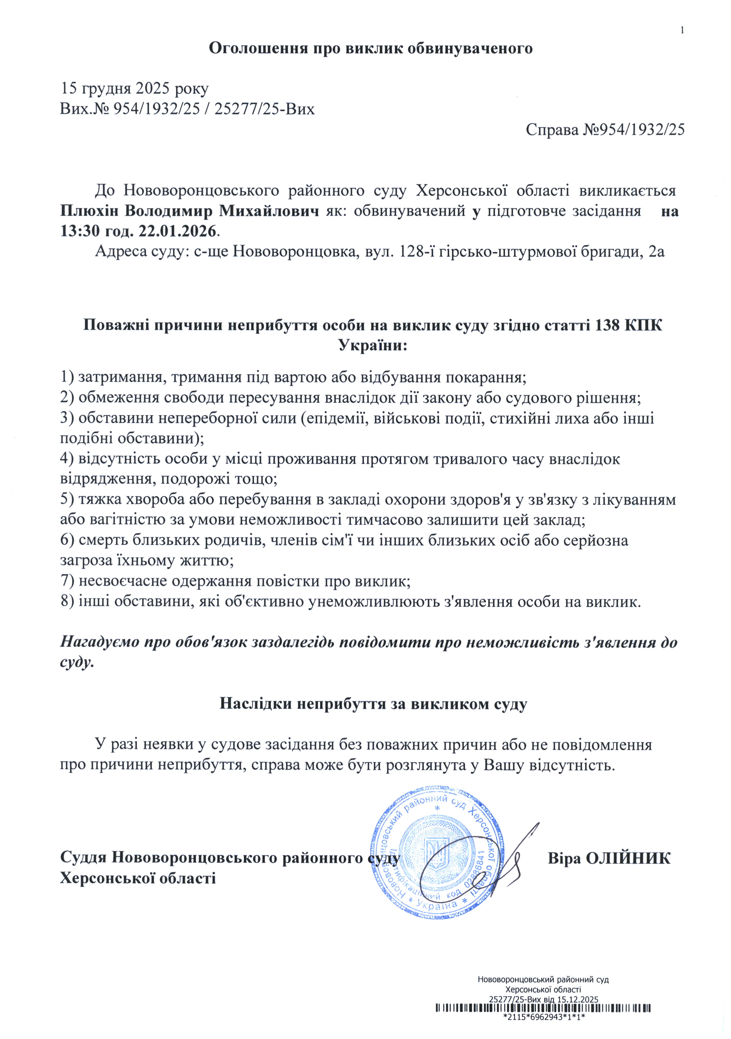 До суду викликається Плюхін Володимир Михайлович на 13 год. 30 хв. 22 січня 2026 року